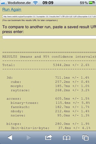 Hier ist nochmal ein Beweis für die Browser... Find ich echt krank. Safari auf einem 3GS ist im SunSpider Benchmark mehr als Doppelt so schnell wie iCab Mobile. Die Ergebnise stammen von meinem iPhone 3GS. Bilder hängen an.