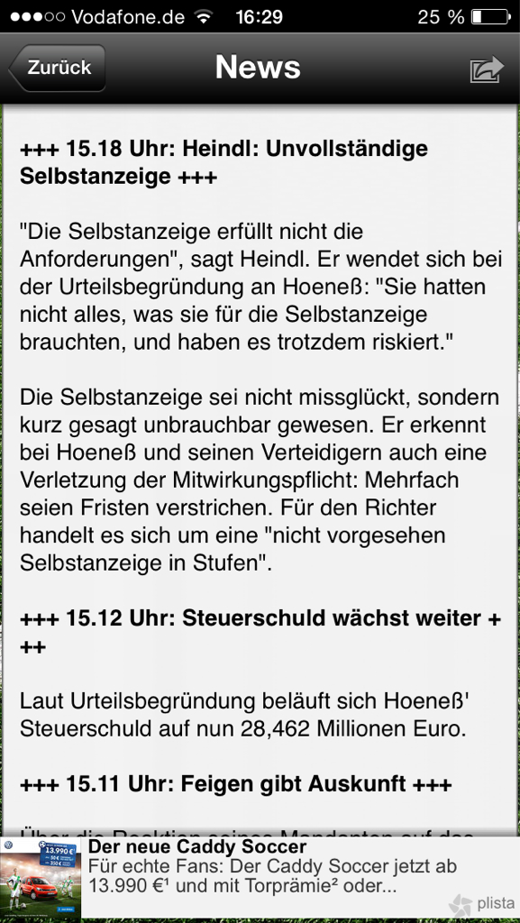 Mittlerweile sind wir bei 28 Mio EUR... Der Richter hat auch gesagt, er zweifelt hart an der Glaubwürdigkeit der Selbstanzeige. Er ist der Auffassung, dass Hoeness sich nicht gemeldet hätte, wenn der Stern Reporter nicht am Recherchieren gewesen wäre. Vor allem die Aussage "Ich habe den Zeitpunkt verpasst" als der Richter nach den Steuer CDs fragte brach Hoeness das Genick. Die Glaubwürdigkeit ist echt berauschend.