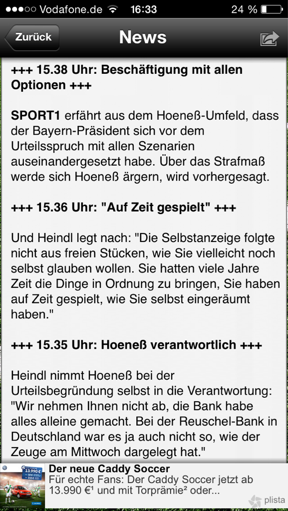 Guckt mal auf Sport 1 die. Liveticker zur Verhandlung, die Meinungen der Presse und von Steuerexperten. Die sind sich alle einig. Hoeness sitzt so gut wie hinter Gittern.