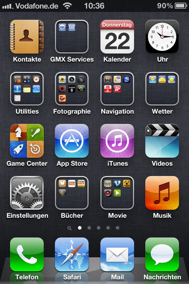 Der erste hier zeigt meinen Homescreen mit der aller ersten Seite. Wie man unten in der Seitennavigation erkennt, gibt es aber noch eine Seite links neben der ersten. Dafür steht diese kleine Lupe :)