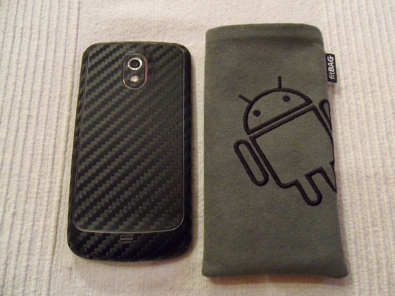 Zusehen ist: die maßgeschneiderte fitBAG Handytasche und die Carbonfolie von Skinomi plus weicher Frontfolie.