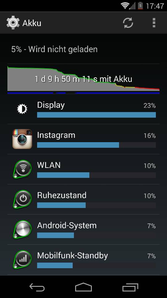 Es ist ja auch kein großes Problem. Jetzt, nachdem ich mein Nexus mal wieder resetet habe, komme ich auch wieder gut 24h+x hin. Außerdem muss es ja auch nicht sein, jeden Tag mehr als 2 Stunden vor dem eingeschalteten Display zu verdödeln, geschweige denn 4 oder 5 Stunden. Trotzdem wäre es natürlich cool mit verbleibenden 35% über den zweiten Tag zu kommen, wenn man es mal versäumt nachts zu laden. Mit dem iPhone ging das manchmal. Mit dem Nexus kaum. Was sagen denn die (Standby)laufzeiten anderer Androiden? Ich hatte eine Weile das HTC One und das machte, wenn ich das so erinnere, im sowohl im Standby als auch bei eingeschaltetem Display einen besseren Eindruck.