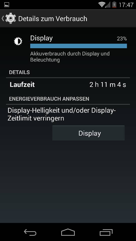 Eigentlich doch nicht. Die DisplayOn-Zeit ist doch relativ mager gegenüber anderen Geräten. Beim One M7 wars besser und beim iPhone 5 waren das immer gut 5h. Beim Nexus ist meist bei 2,5h Schluss.