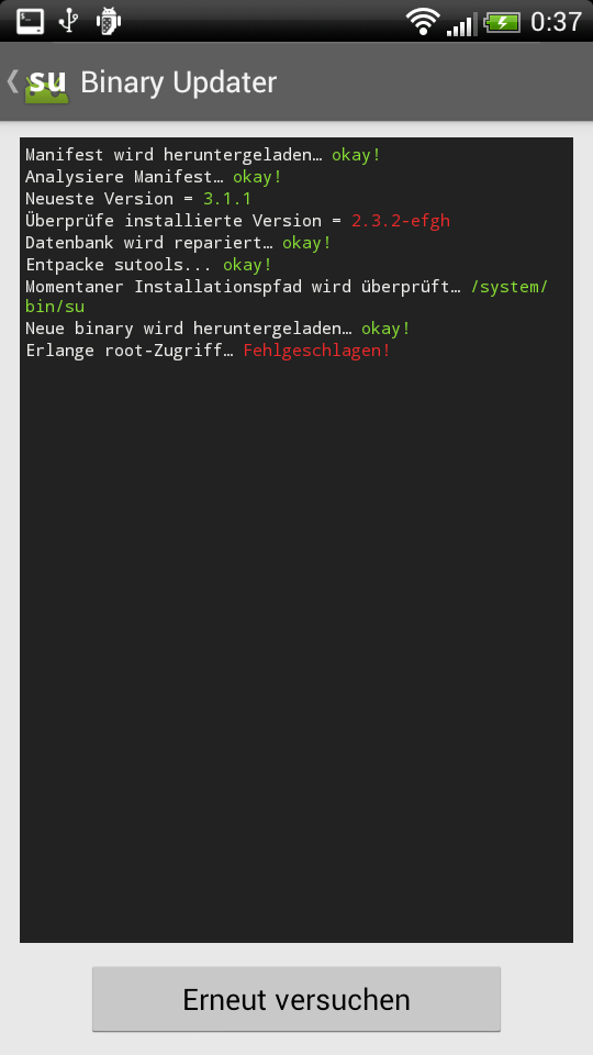 jetzt funktioniert root offenbar nicht. Titanium Backup gibt einen Fehler aus. Unter anderem steht, ich solle mich vergewissern, dass es gerootet ist (das nehme ich mal an anhand des superuser Icons im Menü) und dass BusyBox installiert ist. BusyBox installieren versuche ich gerade, wenn ich in ein Terminal gehe und dort "su" eingebe, kommt lange nichts und dann "permission denied" muss man den Super User Patch irgendwie noch freischalten?