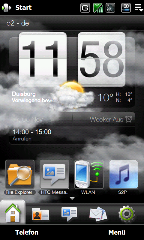 Immer noch ohne Touchflow und mit Homecustomizer vom Marketplace den Homescreen nach meinen Wünschen angepasst. Hab es um Apps, Wetter und Favoritenkontakte ergänzt und Bilder, Musik... was ich nicht brauche entfernt.