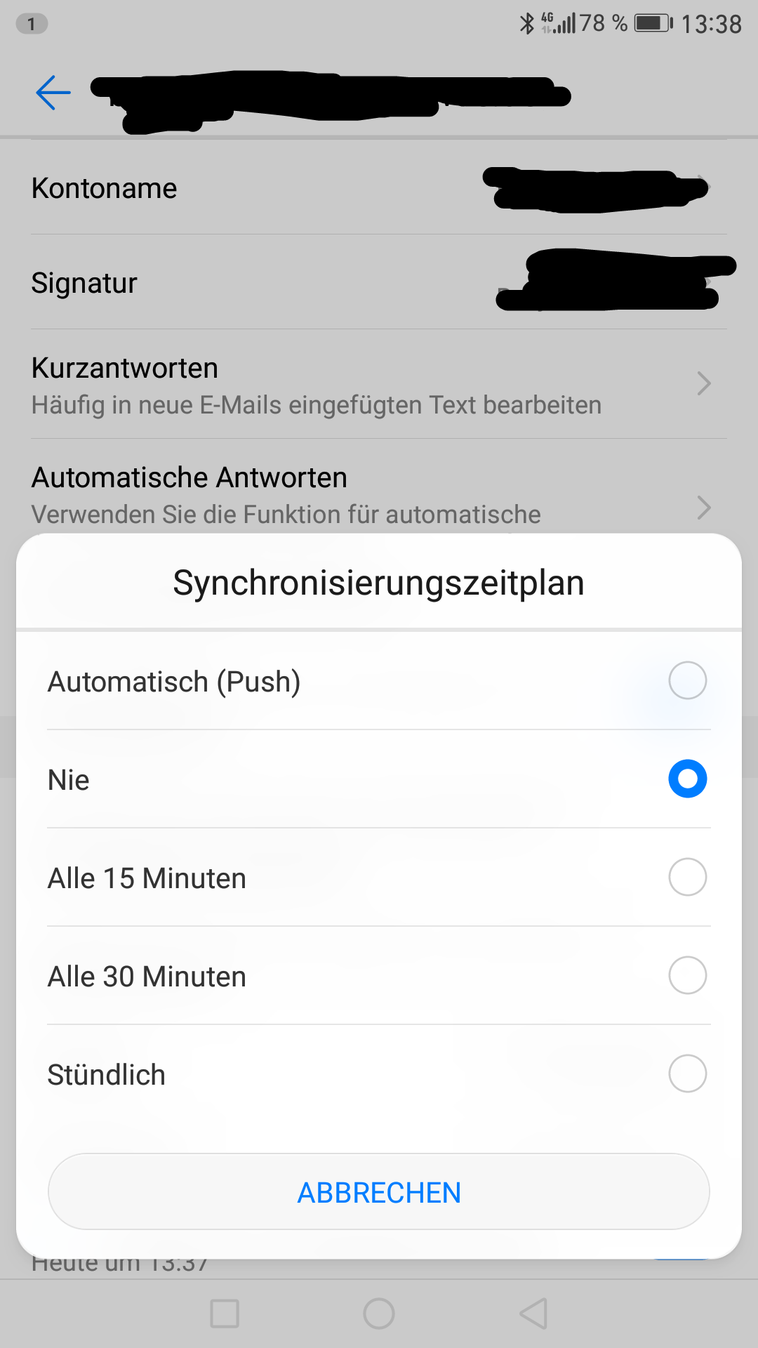 Zwischen "Kontoname" und "Signatur" habe ich noch ein Menu "Mein Name", dazu fehlt beim Synchronisierungszeitplan die Option "Automatisch (Push)"