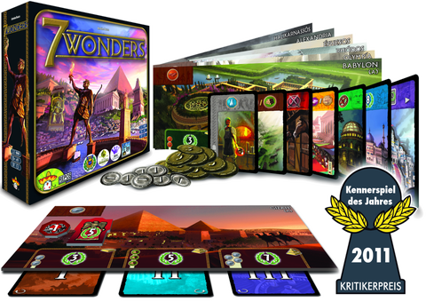 Alle Karten sind, wie das gesamte Spiel, graphisch aufwändig und ansprechend gestaltet und erfüllen unterschiedliche Funktionen. Dazu kommen sieben Weltwunder-Spielpläne und Karten, denn jedes Wunder hat andere Ressourcen, die zum Bau benötigt werden, umfasst unterschiedliche Bauphasen und bringt verschieden viele Siegpunkte sowie andere Vorteile im Spielverlauf. So ist es beispielsweise mit dem Zeus von Olympia möglich, sobald die zweite Bauphase abgeschlossen ist, pro Runde ein Gebäude kostenlos, ungeachtet der auf dessen Karte angegebenen notwendigen Rohstoffe, zu errichten.