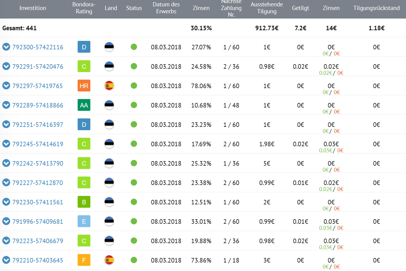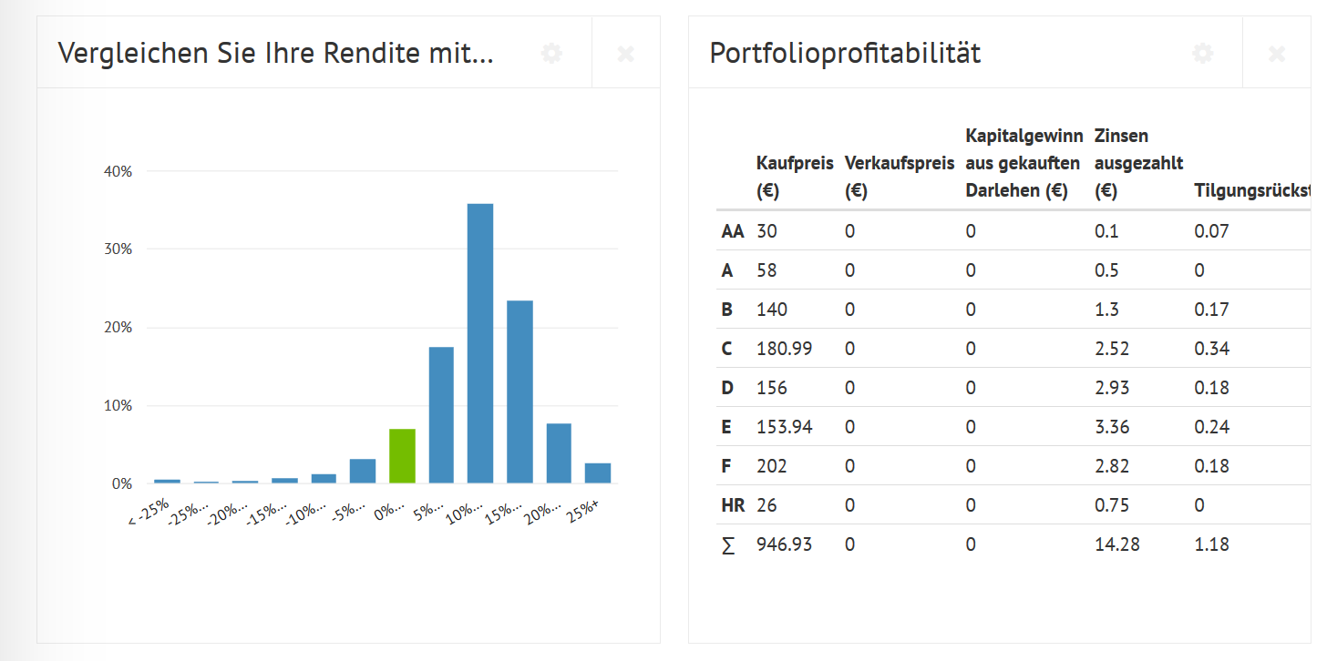 Aber wir sind vom bisherigen Zwischenergebnis dennoch positiv überrascht. Dass sich bei dieser Portfolio-Gestaltung, wo über die Hälfte unterhalb des C-Ratings liegt, dennoch so deutlich Renditen abzeichnen, erstaunt. Interessant sind auch die einzelnen Kredit-Details, wo für jedes Darlehen angezeigt wird, wer dies wo und mit welchen Konditionen und Hintergrunddaten in Anspruch genommen hat. Man erschauert aber hier ab und zu, zu welch hohen Zinssätzen die Leute teilweise diese Darlehen aufgenommen haben. Da ist es durchaus beruhigend zu sehen, dass die Kreditsummen, um die es dabei oftmals geht, nicht so horrend sind.