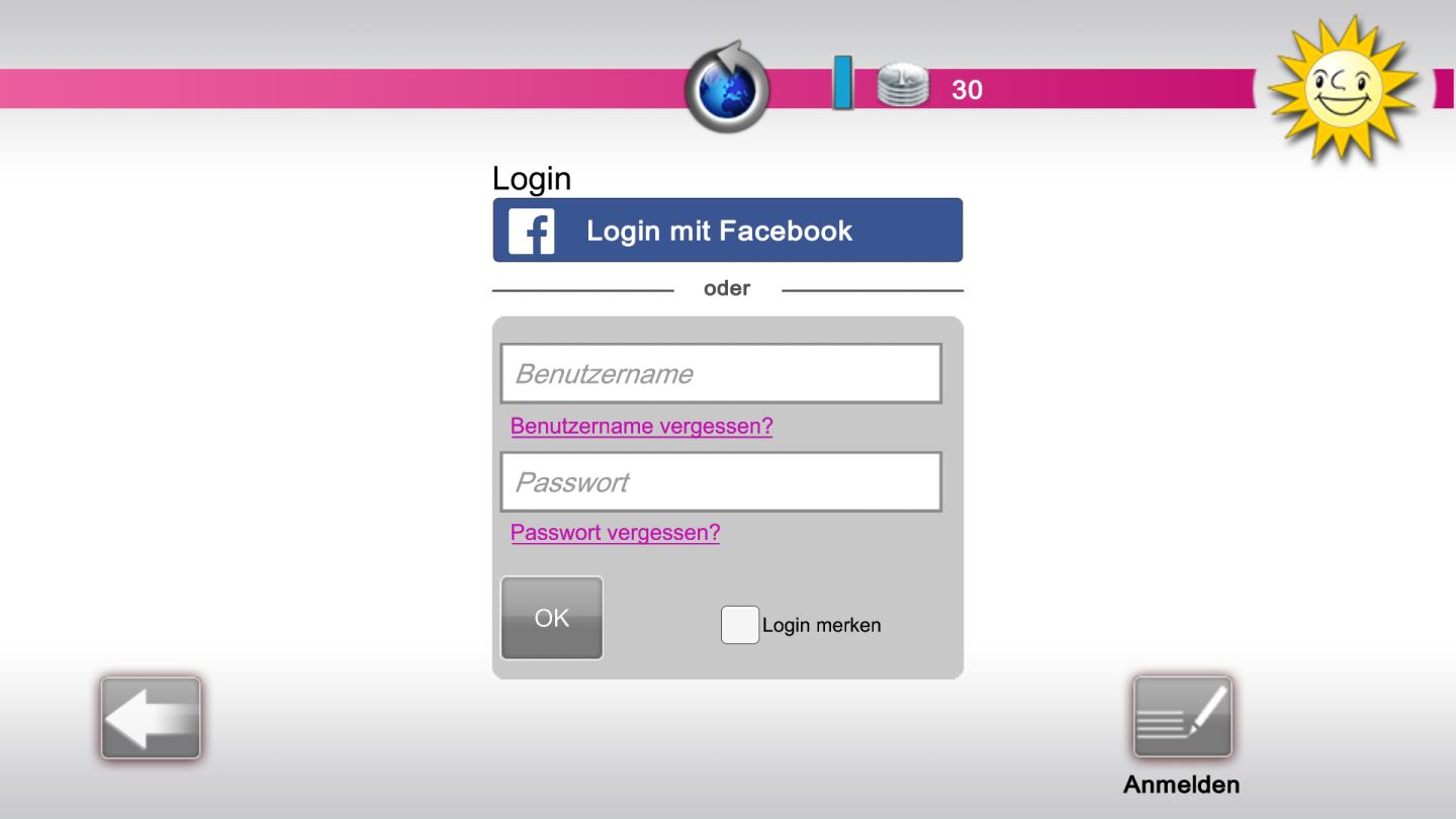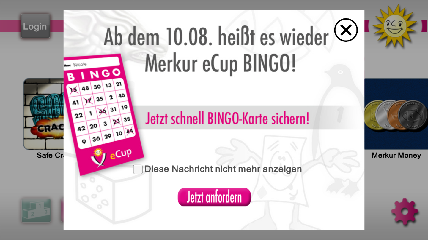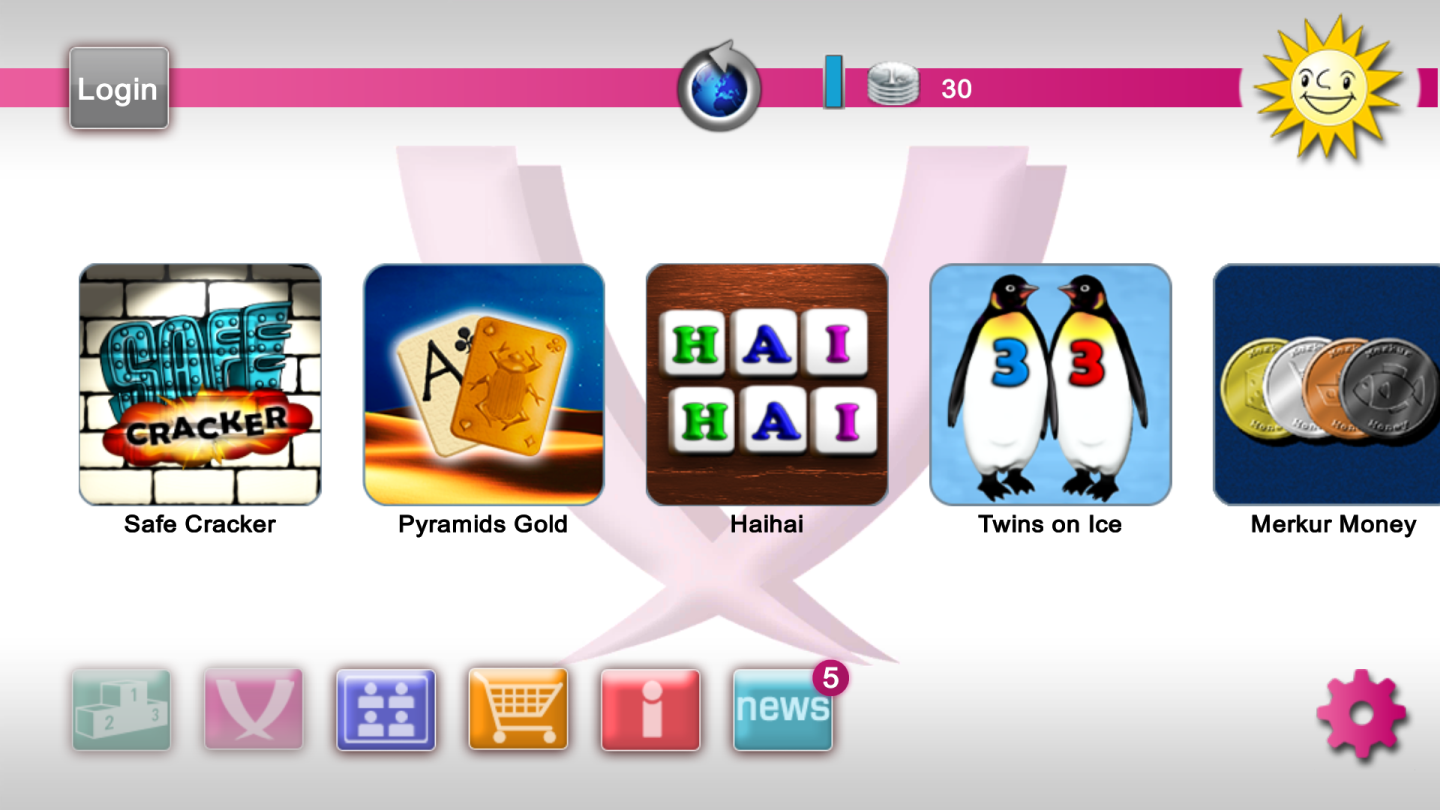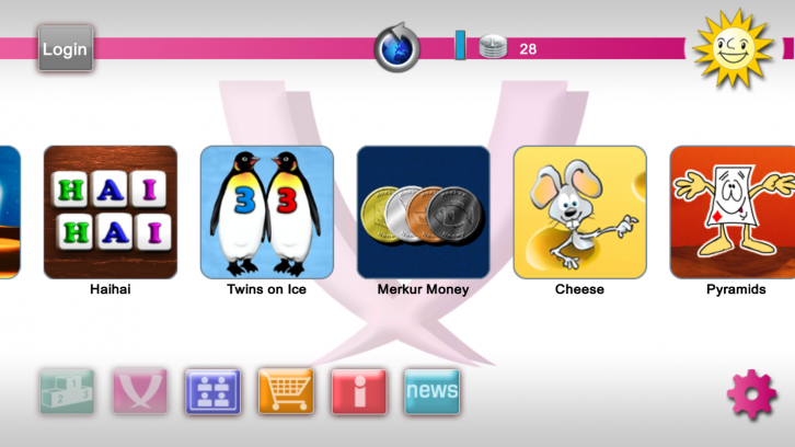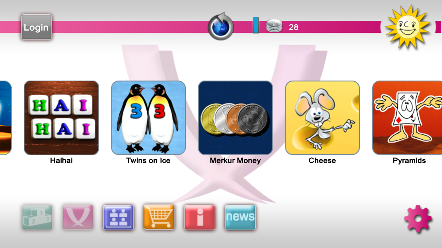 Nach der Installation und dem Start der App werden direkt die sieben Spiele präsentiert: Cheese, Hai Hai, Merkcur Money, Pyramids, Pyramids Gold, Safe Cracker sowie Twins on Ice. Eine Login-Möglichkeit erlaubt es, sich mit Benutzer_innenname und Passwort anzumelden oder aber Facebook für den Login zu nutzen. Doch auch ohne Anmeldung lässt sich Merkur eCup fast uneingeschränkt spielen! Eine Anmeldung beschert einem 70 kostenlose Münzen, die für Spiele eingesetzt werden können und die Möglichkeit in der Community unter dem Motto “Be a part of it” teilzunehmen. So kann man auch in Live-Turnieren andere eCup-Spielende kennenlernen. Die Münzen füllen sich übrigens automatisch wieder auf: Jede halbe Stunde kommt kostenlos wieder eine hinzu, bis zu fünf mal.