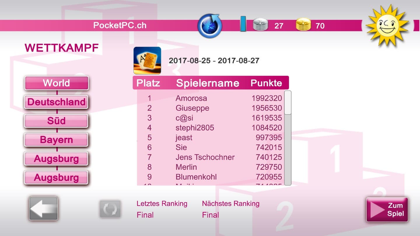 Damit gab es beispielsweise zum 01. Februar dieses Jahres eine Newcomer-Challenge für alle, die in der Weltliga des Spiels Pyramids einen Platz ergatterten, ein Samsung Galaxy S7 sowie ein Samsung Galaxy Tab A zu gewinnen. Ein zweites Samsung Galaxy Tab A gab es in der Deutschlandliga und in den Regionalligen wurden 20 Google Play- bzw. Apple iTunes Gutscheine im Wert von 50,- Euro verlost. Also kann man ganz kostenlos mit Geschicklichkeits- und Kombinationsgabe sowie etwas Glück attraktive Preisen gewinnen, auch wenn man gerade erst angefangen hat, mitzuspielen, da nicht nur die vordersten Plätze der Rangliste berücksichtigt werden.