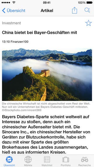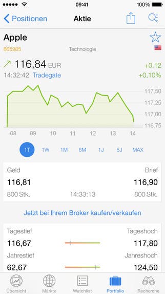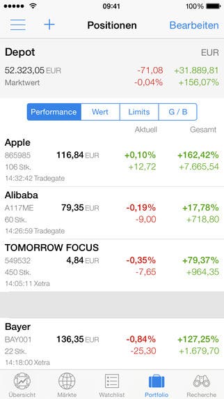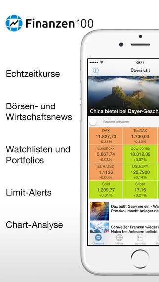 - Leicht bedienbare und komfortable Portfolios und Watchlisten (automatische Synchronisierung mit der Webseite www.finanzen100.de und der iPad-App von Finanzen100)