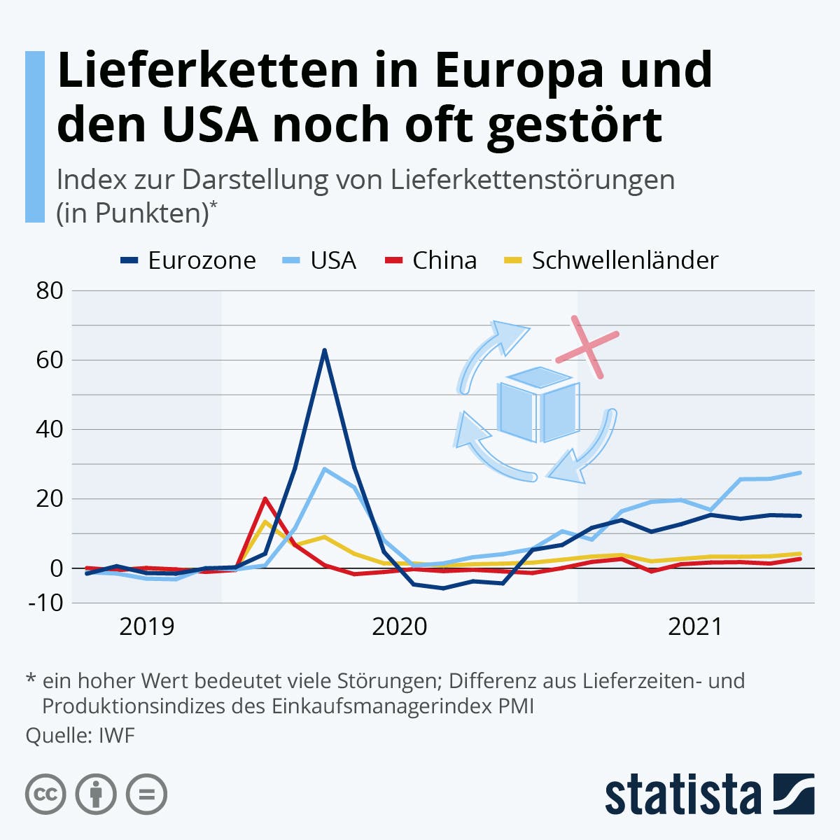 Europäische und amerikanische Lieferketten werden immer noch oft durch die Auswirkungen von der Corona Pandemie gestört. Die Lieferketten vieler Unternehmen sind noch immer von der Corona-Krise betroffen. Dies betrifft vor allem die USA und die Eurozone. Dies zeigt eine Statista Grafik basierend auf Daten des Internationalen Währungsfonds (IWF). Auf der anderen Seite sind Lieferketten in China und Schwellenländern weniger betroffen. Dieser Index wird vom IWF aus der Differenz zwischen dem Lieferdatum und dem Produktionsindex des Managers Index PMI berechnet. Hohe Werte bedeuten Störungen in der Lieferkette.