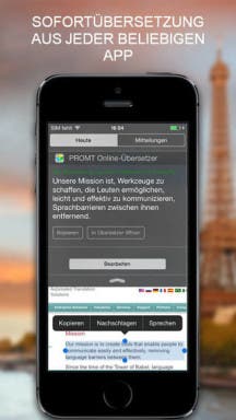 Kürzlich erhielt die App ein Update. Nun kann man die “Sofortübersetzung in jeder App” nutzen und dafür den Heute-Bildschirm des iPhones oder iPads für eben diese Sofortübersetzungen der Zwischenablage konfigurieren. Dazu muss lediglich der Heute-Screen geöffnet werden und über die Schaltfläche “Bearbeiten” das Plus-Symbol des PROMT Übersetzers aktiviert werden. Nach Abschluss der Aktivierung können nun ganz einfach Texte, die sich in der Zwischenablage befinden, automatisch beim Öffnen des Heute-Bildschirms übersetzt werden.