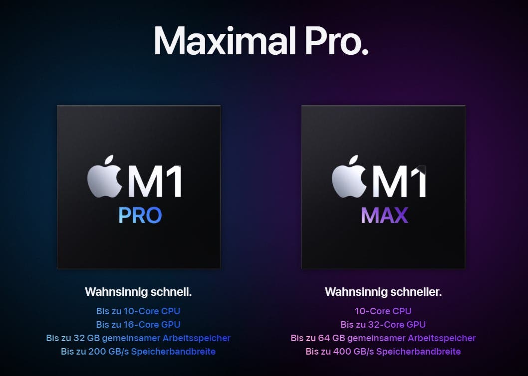 Wie bereits erwähnt, handelt es sich bei meinem persönlichen MacBook Pro um das Basismodell mit dem Apple M1 Pro in der Konfiguration mit 8 CPU-Kernen und 14 GPU-Kernen. Der Sprung auf das nächste Modell mit 10 CPU- und 16 GPU-Kernen ist auf Leistungsbasis fast schon zu vernachlässigen. Deutlich besser wird es erst mit einem Apple M1 Max und satten 24 GPU-Kernen. Da das kleinste MacBook Pro aber bereits irrsinnig teuer “war”, war die Entscheidung für das Basismodell recht klar. Braucht ihr mehr Speicher lohnt vielleicht auch der Aufpreis auf den nächsten Pro-Prozessor und dann mit 1 Terabyte Speicherplatz.