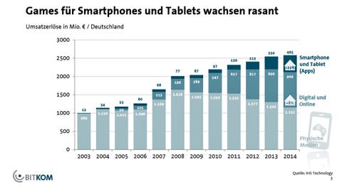 Auch wenn es bei manchen eher ein Stirnrunzeln entlocken dürfte – vor allem alteingesessene Konsoleros und PC-Zocker haben eher ein Problem mit den Gegebenheiten – so ist es mittlerweile schon recht deutlich: Laut BITKOM ist der Umsatz über Smartphones und Tablets mittlerweile deutlich höher, als für Konsolen und Desktop-PCs. BITKOM beruft sich hier auf den Daten des Marktforschungsunternehmens IHS Technology und sagt voraus, dass der Umsatz auf 465 Millionen Euro allein in Deutschland ansteigen wird, was einem Wachstum von gut 33 Prozent zum Vorjahr entspricht und noch deutlich ansteigen soll.