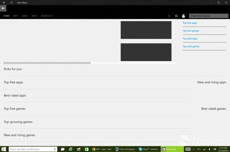 Die letzte grosse Änderung betrifft den Windows Store. Zwar ist dieser in der Build 9901 noch nicht funktionsfähig, doch zeigt er mit diversen sichtbaren Grundelementen, dass Microsoft hier an einem komplett neuen Aufbau arbeitet. Neben der klassischen vertikalen Ansicht der einzelnen App-Beschreibungen, kommen auch neue Kategorien in den Windows Store. Wie es scheint, will der Konzern all seine Inhalte in einer Ansicht bündeln und integriert auch den Kauf von Musik, Filmen und Serien in den Windows Store und lagert diese aus Xbox Music und Xbox Video aus. Somit können die verschiedenen Bereiche gegenseitig die Aufmerksamkeit aufeinander schieben, wenn einzelne Nutzerinnen und Nutzer nur einen oder zwei der Stores verwenden. Zudem macht dies die Bedienung deutlich einfacher.