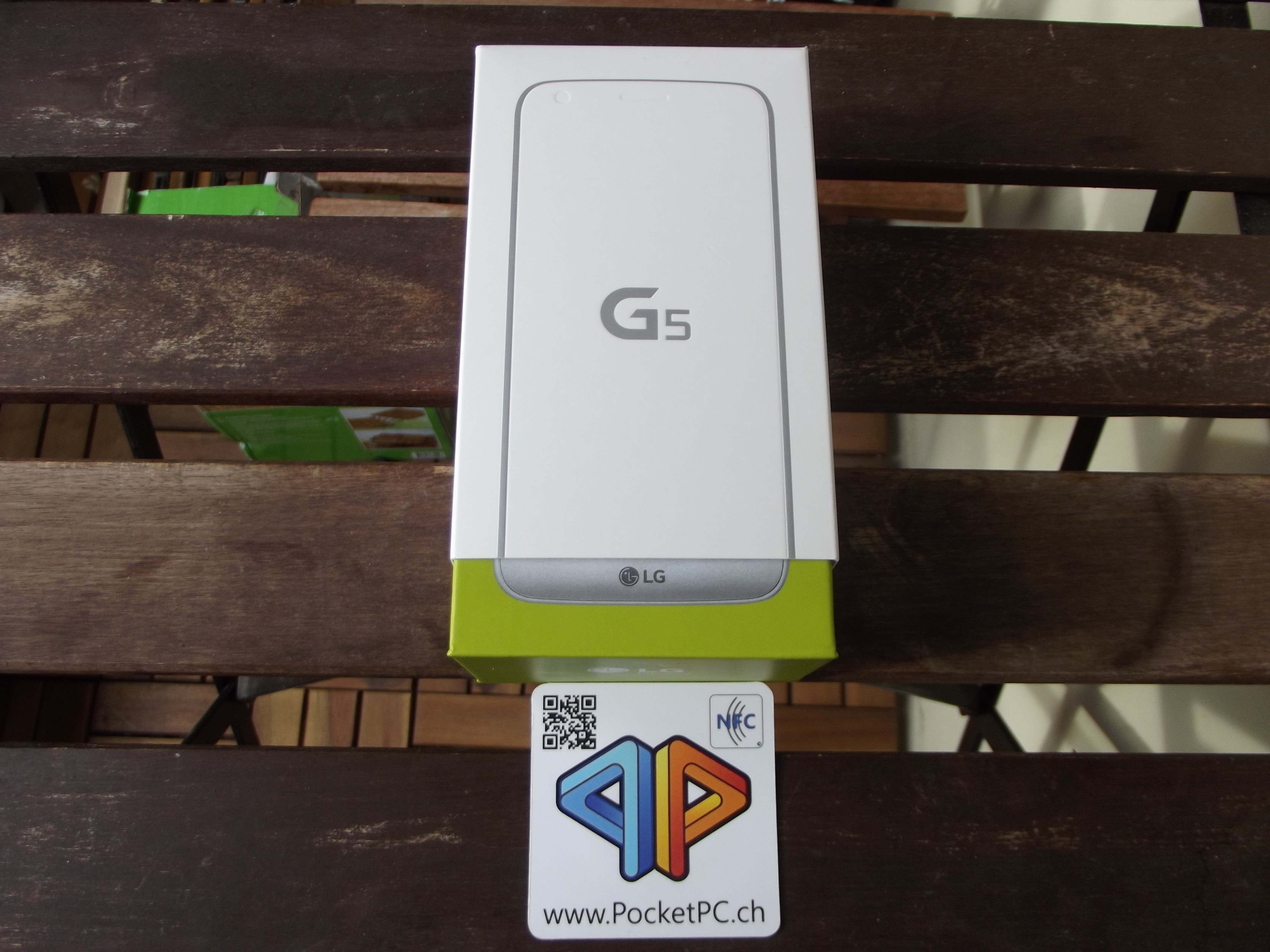 Das LG G5 kommt in einer weiss-grünen Pappschachtel daher, die auch schon auf das auffälligste Feature des Smartphones aufmerksam macht: Den herausziehbaren Akku-Slot. Der Karton besteht aus zwei Teilen. Die “Hauptschachtel”, die das Gerät enthält, ist grün, darüber ist ein dünner weisser Karton gestülpt, auf dem ein skizziertes Smartphone abgebildet ist. Die grüne Schachtel zieht man unten aus der weissen heraus, abgebildet ist hier der Akku des G5. In der grünen Schachtel befindet sich obenauf das Smartphone, in unserem Fall in der Farbe Titan, darunter dann das Netzteil, das USB-Type-C-Kabel sowie ein SIM-Schacht-Öffner und Kopfhörer.