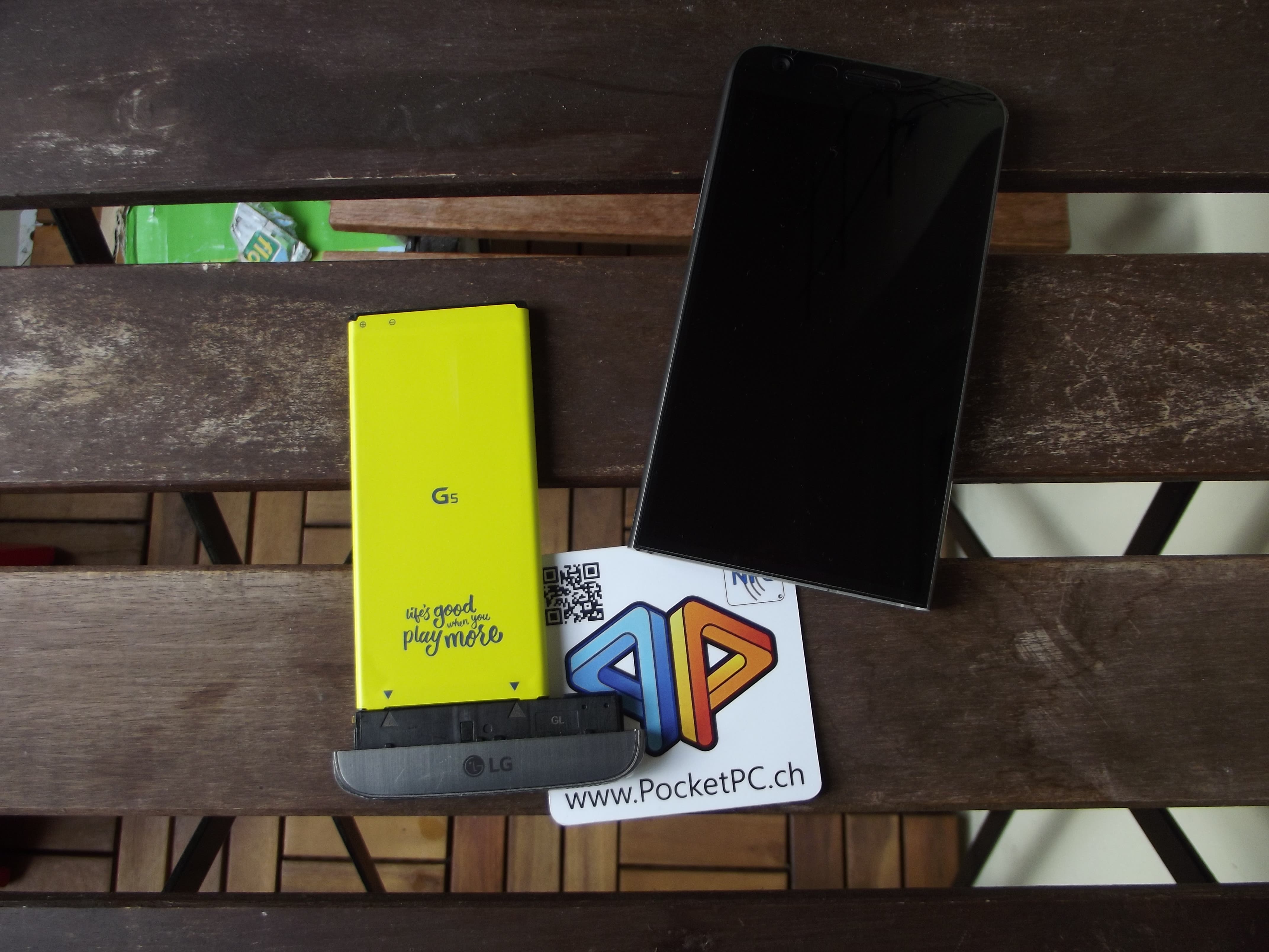 Die Lautstärkewippe befindet sich nun an der linken Seite des Geräts und nicht mehr hinten am An-Aus-Knopf, welcher dort am Rücken bleiben durfte. Die Kamera befindet sich prominent oben mittig am Rücken, die Frontkamera sitzt oben links auf der Vorderseite. Vorn rechts ist die Benachrichtigungs-LED angebracht, diese leuchtet je nach App in verschiedenen Farben. An der rechten Seite befindet sich der Nano-SIM- und Micro-SD-Slot, an der oberen Kante der 3.5 mm Klinkenanschluss. Unten befindet sich in der Mitte der USB-Type-C-Anschluss, am linken Rand unten der Auswerfknopf für den Akku-Slot. Dieser ist wirklich speziell, das Einlegen des Akkus findet durch das Einschieben des Slots statt. Der Akku ist in gelb gehalten, auf ihm prangt LGs Logo für dieses Jahr: “life’s good when you play more”. Der Slot selbst lässt sich mit dem fest angebrachten Akku nicht falsch herum einsetzen. Im Inneren befinden sich ausserdem Anschlüsse für das modulare Zubehör zum G5, also zum Beispiel das Cam Plus Modul, welches spezielle Kamerafunktionen und 1’400 mAh zusätzlichen Akku liefert.