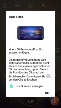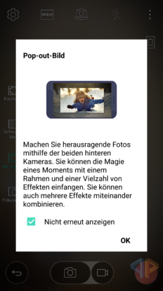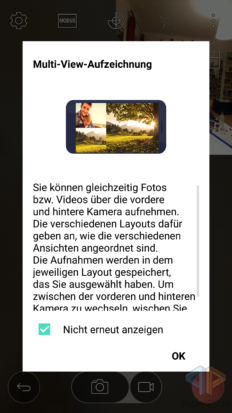Der Profi-Modus wurde vom LG G4 übernommen und bietet sehr viele Einstellungsmöglichkeiten für Kenner_innen. Sonstige Modi sind Panorama, Snap, Multi View, Pop Out, Zeitraffer und Zeitlupe. Besonders interessant ist hier, wie bereits erwähnt, der Pop Out Modus, bei dem die beiden Linsen der Hauptkamera zum Einsatz kommen. Mit Multi View werden alle Kameras gleichzeitig benutzt. Für die Kamerareview werden wir auch den Profi-Modus ordentlich ausreizen, um zu schauen, ob die Verwaschungen bei den Bildern evtl. an einem schlecht eingestellten Normal-Modus liegen.