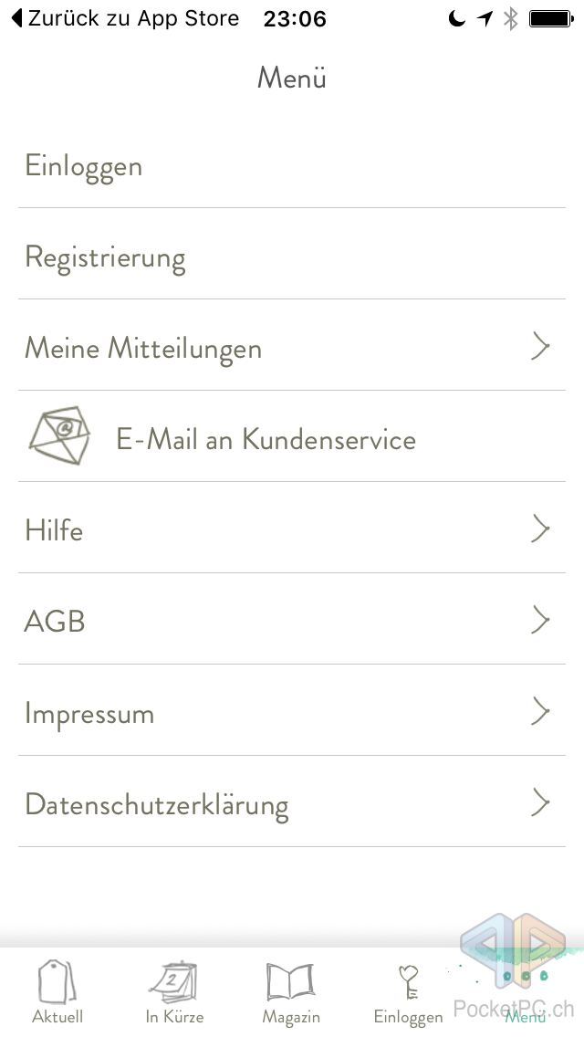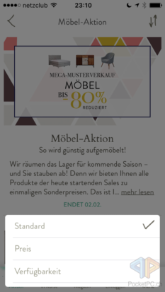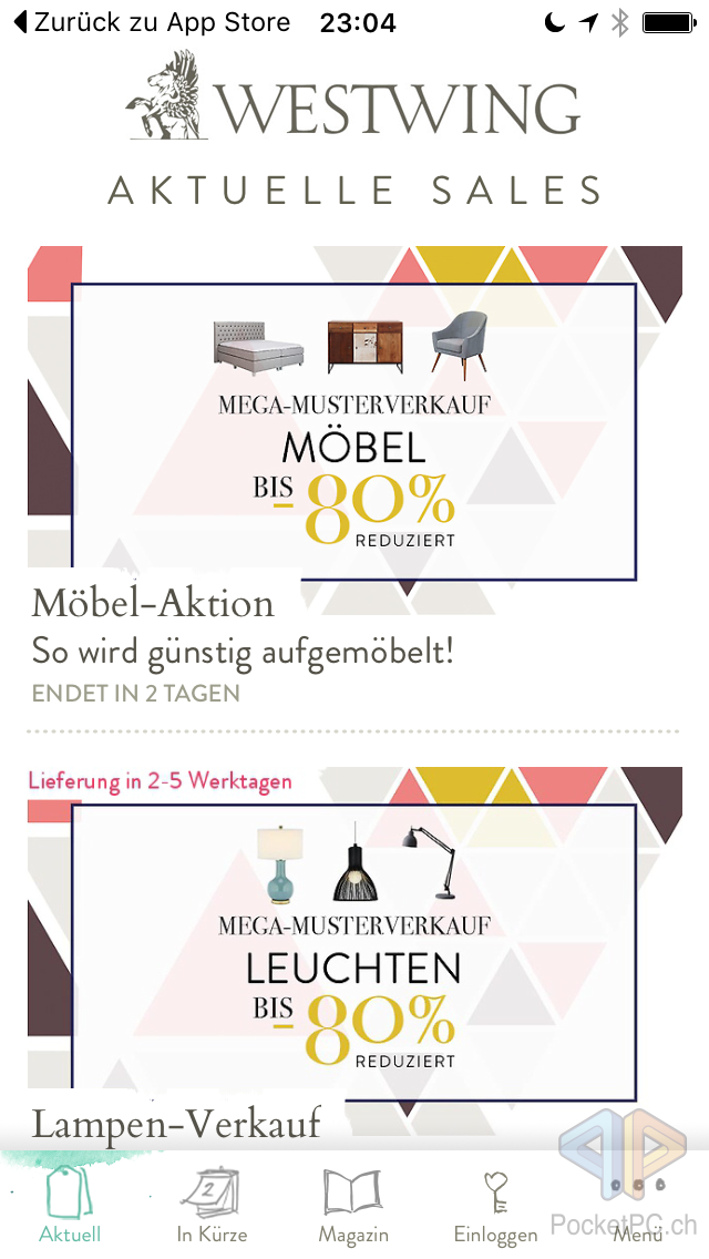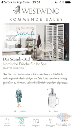 Die App ist ansprechend und frisch gestaltet, sieht anregend anders aus mit seinem grau-weissen, unaufgeregten Design. Sie ist gegliedert in einen Hauptbereich und fünf Menüpunkte. Startpunkt sind aktuelle Sales, wo reduzierte Möbelstücke und Accessoires jeweils mit Bild, Rabattumfang und Zeitraum aufgelistet werden. Der zweite Eintrag In Kürze zeigt, welche Aktionen in Zukunft angeboten werden und wann dies soweit sein wird.