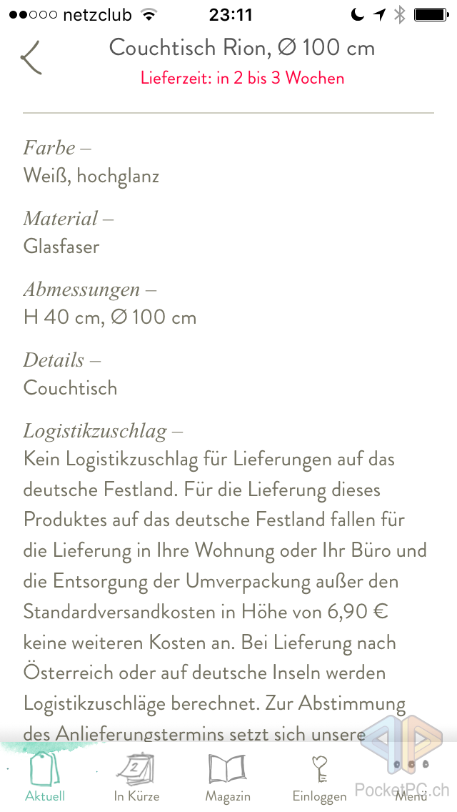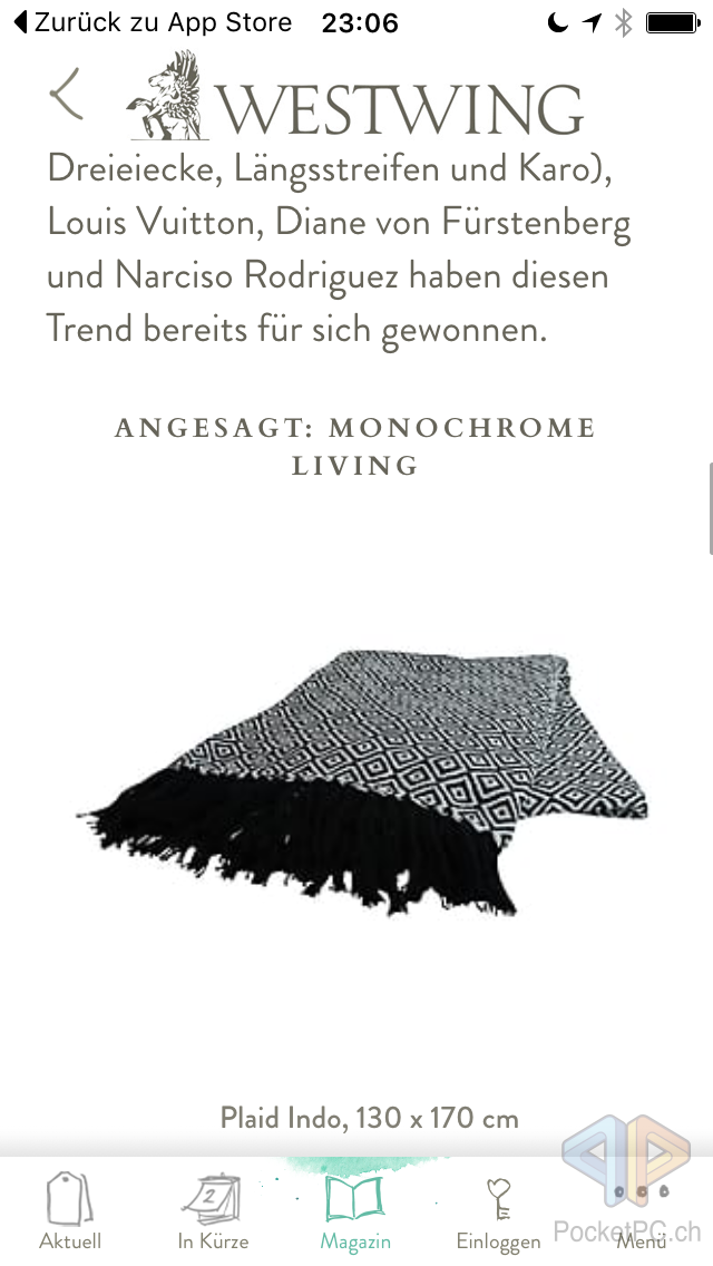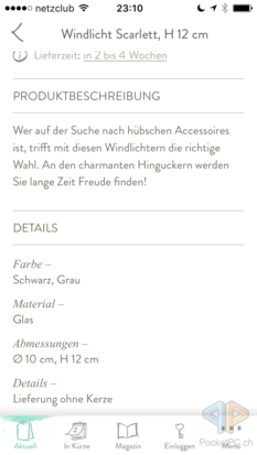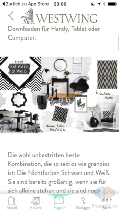 Die Auswahl an Produkten ist schier unerschöpflich, von Tischen und Sitzmöbeln bis hin Teelichthaltern, Kissen, Bezügen und Vorhängen ist alles da, was das schwedische Möbelhaus und der Rote Stuhl um die Ecke eben nicht unbedingt zu bieten haben. Die Preisspanne reicht dabei von wenigen Euros bis hin zu tausenden Schweizer Franken. Ob es sich dabei wirklich um Schnäppchen handelt, ist nur schwer zu beurteilen und auch weniger Gegenstand dieses Testberichts, da viele Produkte exklusiv zu sein scheinen. Wer aber auf edle Designerstücke steht oder sich einfach davon inspirieren lassen möchte, sollte sich die App auf jeden Fall installieren.