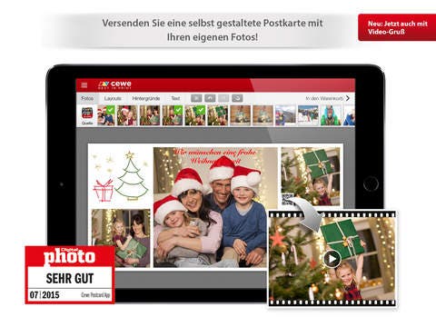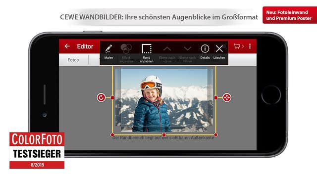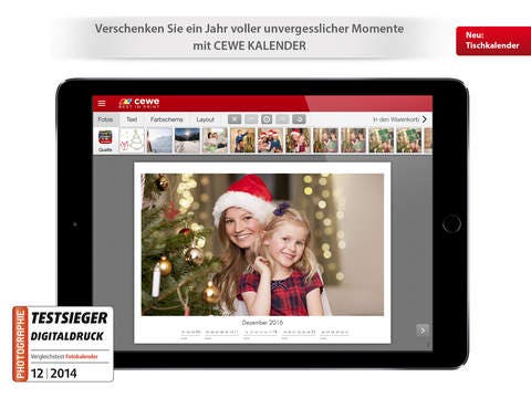Das Design selbst ist sehr übersichtlich und vor allem auch intuitiv gestaltet. Das Menü auf der oberen Leiste gibt euch Aufschluss über verfügbare Produkte wie Postkarten, Smartphonehüllen, Kalender oder das bekannte CEWE Fotobuch. Sucht ihr die jeweilige Option aus kommt ihr schon in den dafür erdachten Editor und könnt mit dem Design eures Produktes starten. Dabei bedient sich das Gerät aus eurer Fotogalerie und daher solltet ihr auch beim ersten Anfragen darauf achten, das ihr CEWE die Freigabe für die Fotos erteilt. Sonst könnt ihr das in den Einstellungen des Systems noch nachholen.