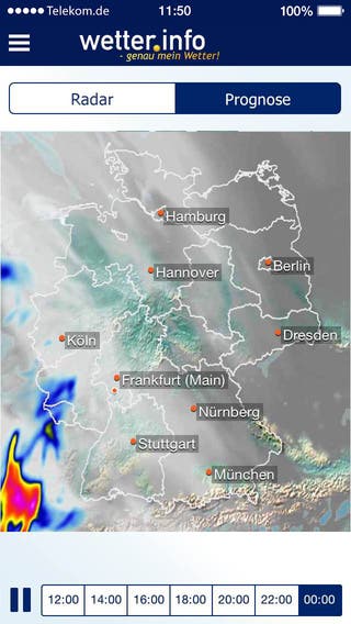 Auf iOS wirkt die App vom Design her etwas deplatziert. Die sehr kräftigen Dunkelblau- und Weiss-Töne sind ein starker Kontrast und anfänglich etwas gewöhnungsbedürftig, problematisch ist das allerdings nicht. Dafür ist Wetter.info, welche von der Deutschen Telekom entwickelt und gepflegt wird, gut strukturiert und leistet sich in der Navigation kaum schwächen. Über das Menü an der linken Seite gelangt man in alle relevanten Übersichten wie Niederschlagsradar, Wettervideos, Karten zum Wetter und vieles mehr. Die Telekom beschreibt die App mit folgenden Features für die jeweilige Plattform wie folgt:
