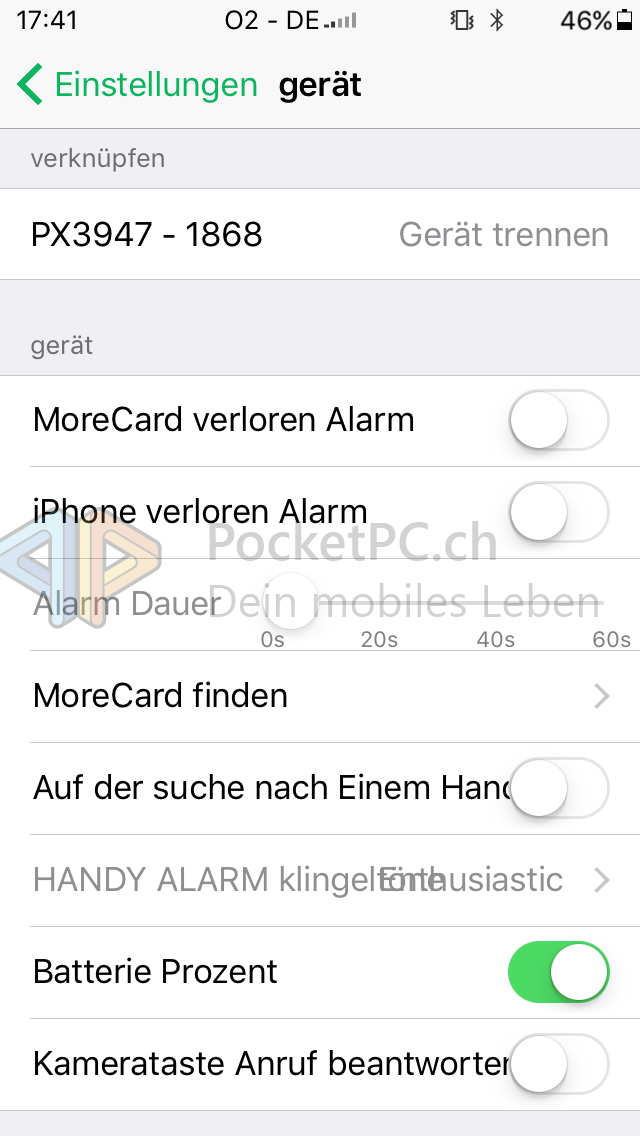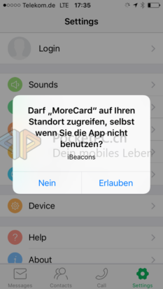 Die SIM-Karte im Adapter kann nun das 850, 900, 1800 und 1900 MHz Frequenzband für GSM-Funk benutzen und Anrufe sowie SMS empfangen und senden. Die App MoreCard ist sehr einfach und intuitiv aufgebaut und erinnert stark an die systemeigenen Nachrichten- und Anruf-Apps. Ein Login in der App selbst bringt nur wenig Nutzen mit sich, namentlich die Synchronisation der Daten in die Cloud. Ansonsten lassen sich in MoreCard die Benachrichtigungs- und Klingeltöne genauso konfigurieren wie die Vibration des iPhone und des Adapters. Darüber hinaus kann der DualSIM-Adapter auch als Handy-Finder fungieren, indem beide Geräte, iPhone sowie die kleine weisse Box, sich bemerkbar machen, sollten sie zu weit voneinander entfernt werden. Dabei kann auch die letzte bekannte Position der MoreCard in der App gespeichert werden.
