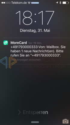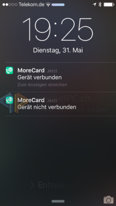 Benachrichtigungen wie verpasste Anrufe oder eingegangene SMS können, entsprechende Berechtigungen vorausgesetzt, auch ganz normal im Benachrichtigungscenter von iOS angezeigt werden, so auch auf dem Sperrbildschirm. Damit fällt in Sachen usability kaum ein Unterschied zur eingebauten SIM des iOS-Geräts auf.