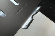 Die gebogene Konstruktion nimmt oben den Laptop auf und hat auch einige eingefräste Rillen zur Verfügung. Diese können die Luftaufnahme optimieren, da Laptops mit unten liegenden Lüftern in diesem Fall etwas mehr Luft ziehen können. Für das MacBook Pro ist das zwar irrelevant, aber dennoch ein kleines und nettes zusätzliches Feature. Die Unterseite des Ständers ist mit griffigen Füssen versehen, die einen sicheren Stand vermitteln. Die Rückseite fasst übrigens ein grösseres ovales Loch, dass entweder als Tragegriff oder gar als Kabelführung dienen kann. Je nachdem wie ihr die Kabel auf eurem Schreibtisch legen wollt.