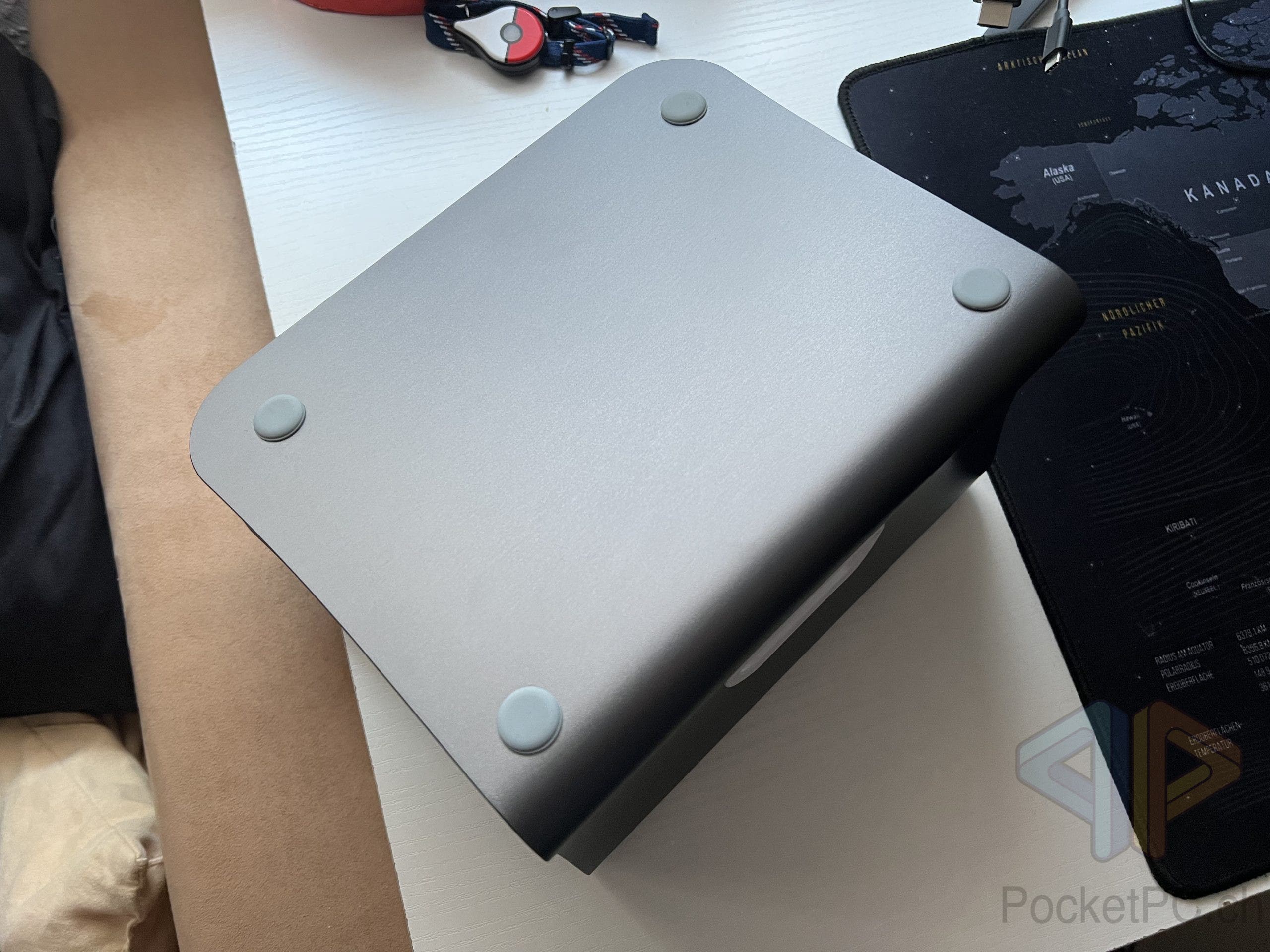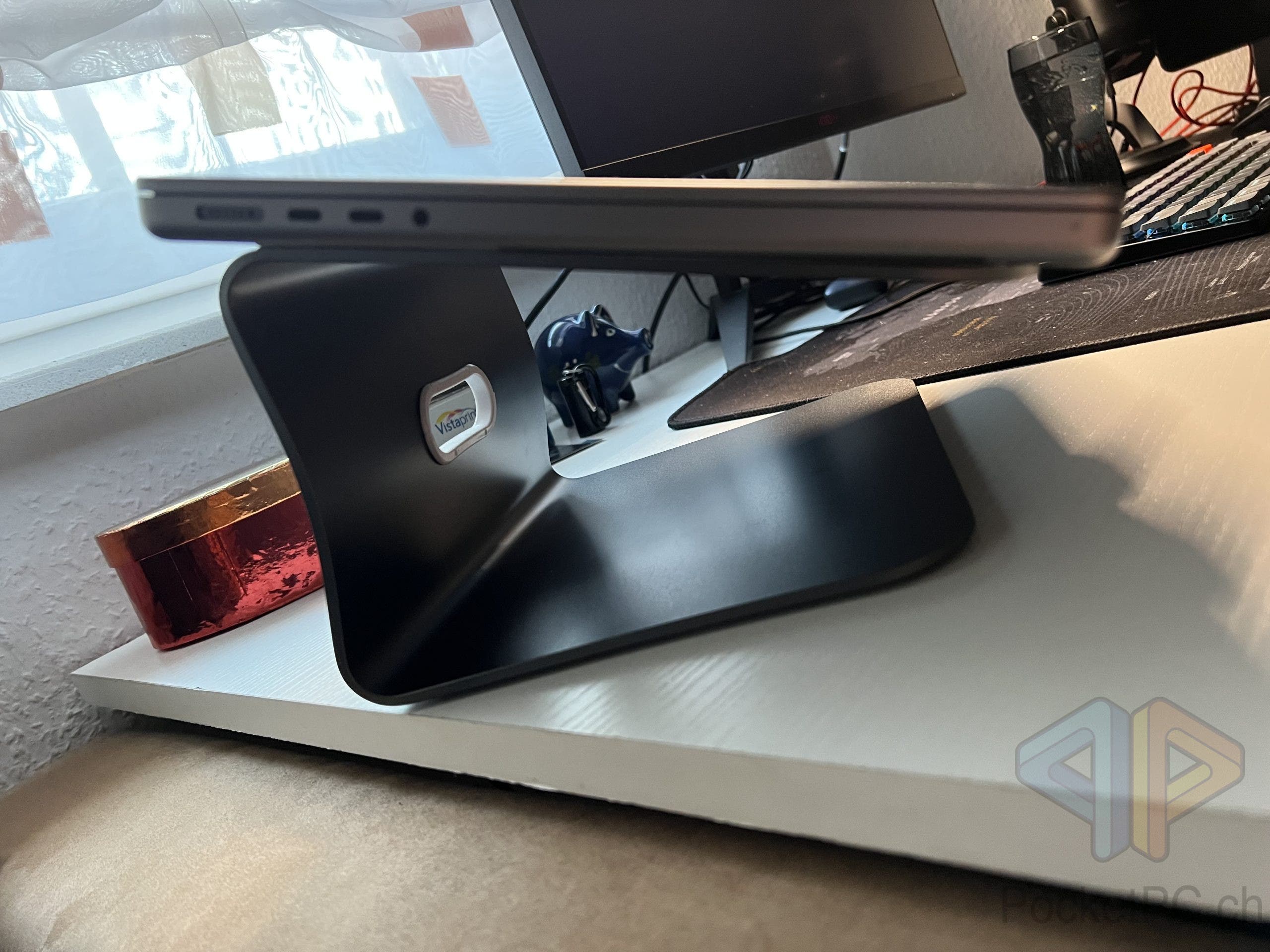 Was nicht funktioniert hat, zumindest im Falle meines MacBook Pro 14 Zoll ist die Nutzung des Ständers als Arbeitsfläche. Ich dachte erst, dass mir die gekippte Neigung der Tastatur entgegenkommen würde, doch die Oberfläche des MacBooks ist so glatt, dass ich immer wieder mit den Handballen nach einiger Zeit abrutschte. Auf Dauer war das anstrengend. Doch lässt sich der Stand super als “Bildschirmständer” nutzen und so verwende ich ihn auch nun seit einigen Wochen.