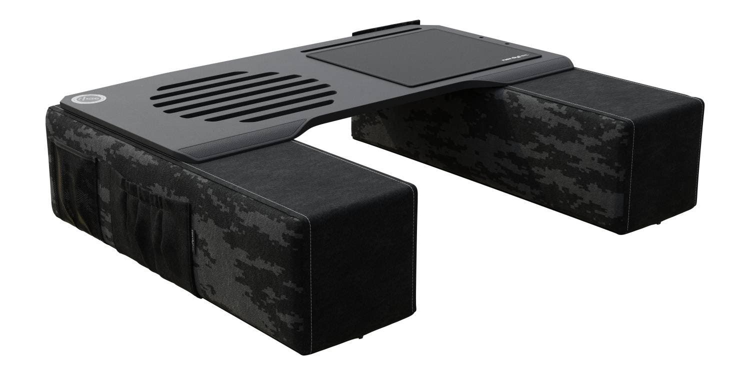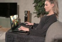 Die Konstruktion überrascht erst einmal, denn es ist nichts wirklich mit einander verbunden. Das Konstrukt beinhaltet zwei grosse Kissen, die rechteckig gestaltet und sehr stabil gebaut sind. Dazu kommt eine Art Brett aus Bambusholz mit sowas wie ein “Lüftergitter”. Dieses wird auf die beiden Kissen links und rechts neben euch auf der Couch gelegt und bildet so den Tisch für den Laptop und die Maus. Das Gitter ist ein Luftein- und/oder -durchlass für das Notebook. Eine simple aber doch smarte Lösung, denn auf einem weichen Untergrund würden die Notebooks nicht mehr genug Luft einsaugen oder abführen können.