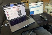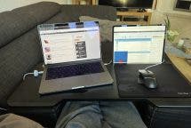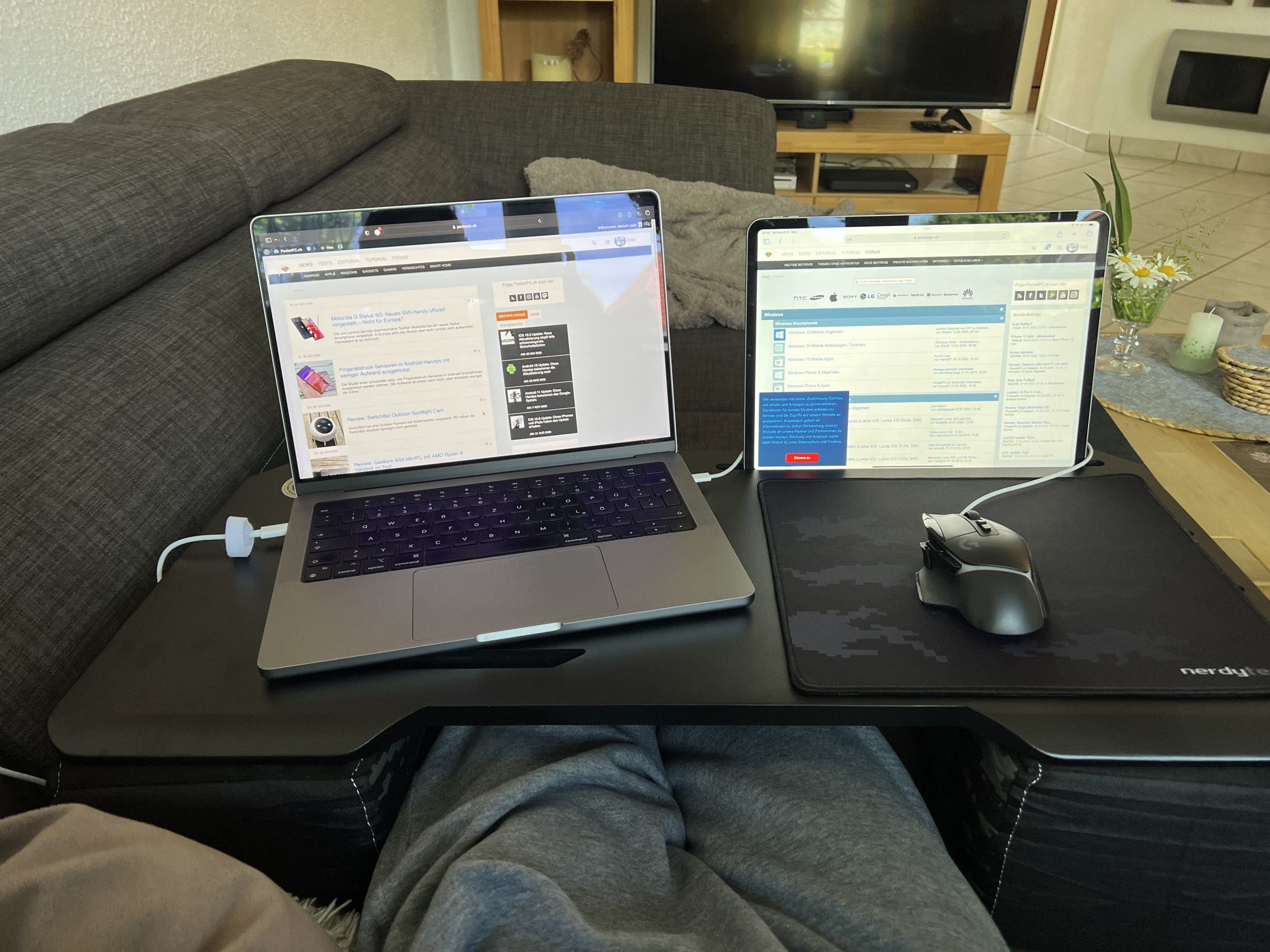 Die Konstruktion braucht allerdings ein wenig Platz. Denn die Kissen sind eigentlich auch als Armlehnen gedacht. Darum liegt eines der Kissen links und das andere rechts neben euch – das Holzbrett kommt dann oben drauf. Leicht links versetzt findet dann ein Laptop eurer Wahl Platz und rechts daneben wiederum das mitgelieferte Mauspad. Die Rille darüber fasst ein Tablet. Eure Couch oder Bett sollte also nicht all zu schmal sein. Ich musste einen Teil meines Sofas zumindest etwas ausfahren, konnte aber dann recht bequem darunter liegen.