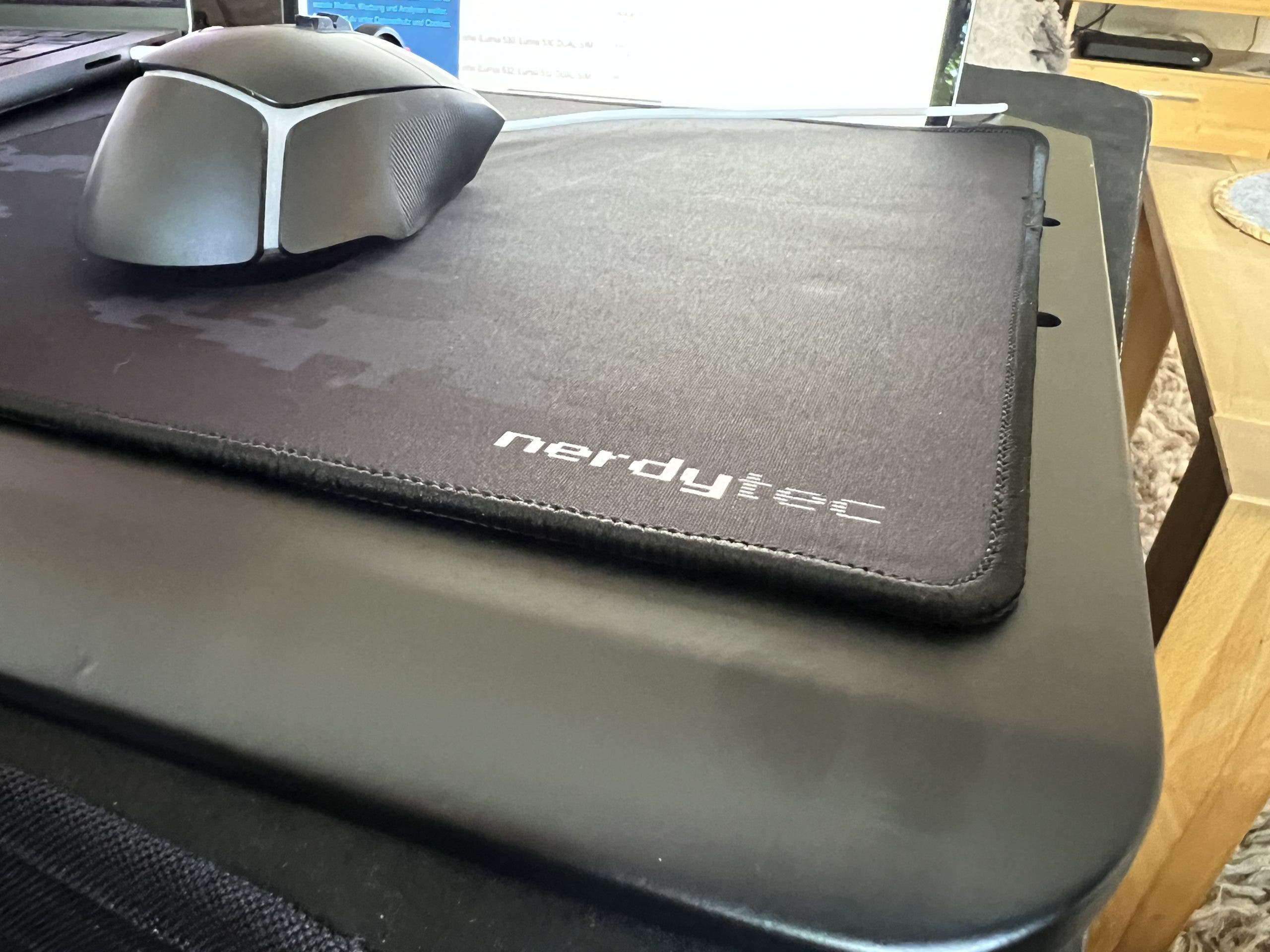 Das Brett wirkt übrigens ebenfalls enorm stabil und ist richtig Dick bemessen. Es handelt sich hierbei um ein aus Bambusholz gefertigtes Stück und ist sehr hochwertig verarbeitet und bietet keine scharfen Kanten oder etwas anderes dergleichen. Der Aufbau gestaltet sich einfach und die unterlagen wirken rutschfest. Insgesamt also ein sehr hochwertiger Eindruck. Löblich: Hersteller nerdytec liefert gleich im Paket ein eigenes Mauspad mit, das genau auf das Brett passt! Es kommt zwar nicht ganz an die Qualität für den Wettbewerb entwickelte Gleitunterlagen heran, ist aber dennoch ordentlich verarbeitet und mehr als brauchbar.