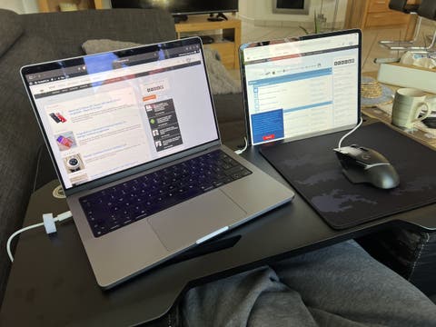 Die Konstruktion braucht allerdings ein wenig Platz. Denn die Kissen sind eigentlich auch als Armlehnen gedacht. Darum liegt eines der Kissen links und das andere rechts neben euch – das Holzbrett kommt dann oben drauf. Leicht links versetzt findet dann ein Laptop eurer Wahl Platz und rechts daneben wiederum das mitgelieferte Mauspad. Die Rille darüber fasst ein Tablet. Eure Couch oder Bett sollte also nicht all zu schmal sein. Ich musste einen Teil meines Sofas zumindest etwas ausfahren, konnte aber dann recht bequem darunter liegen.