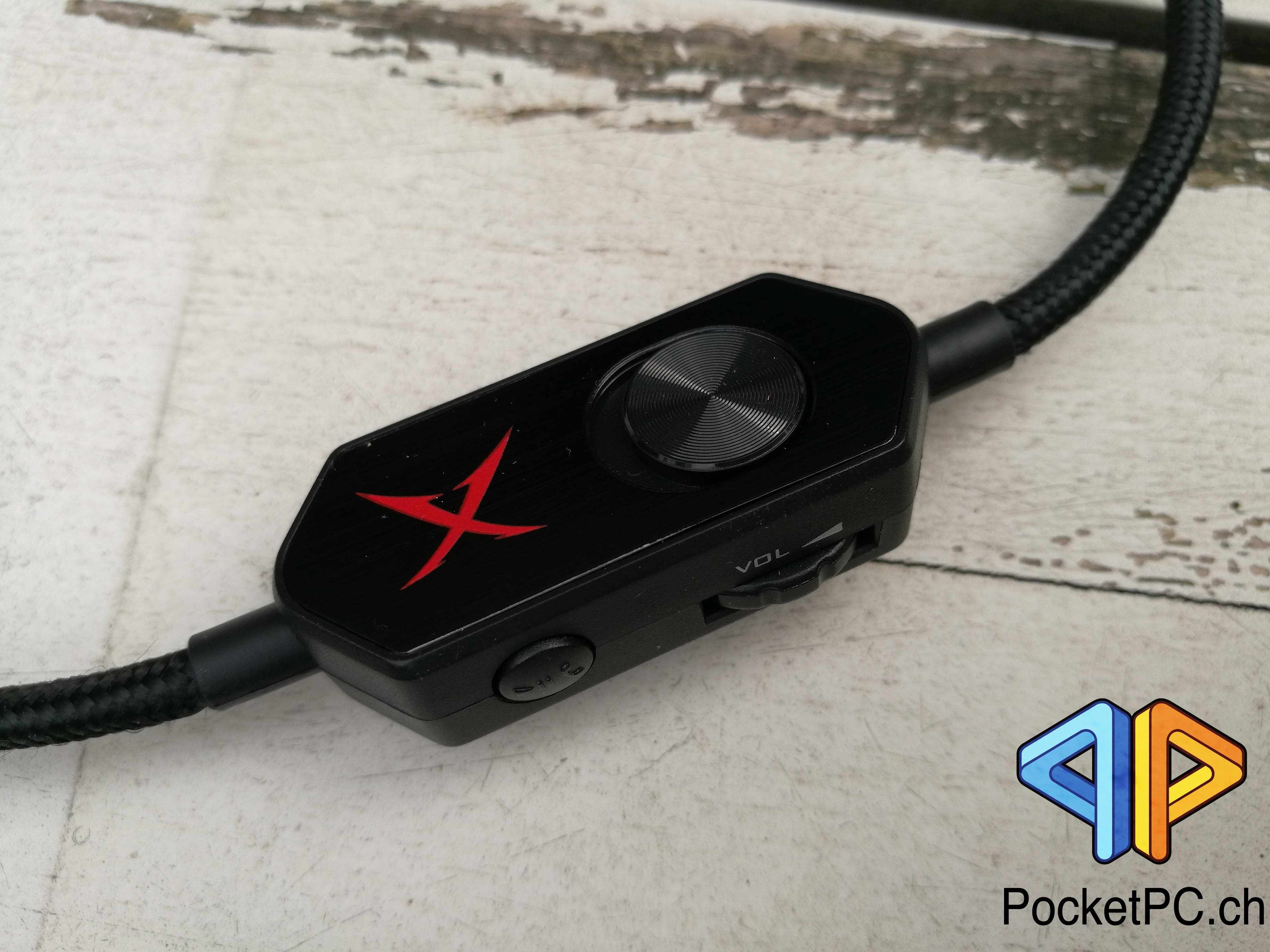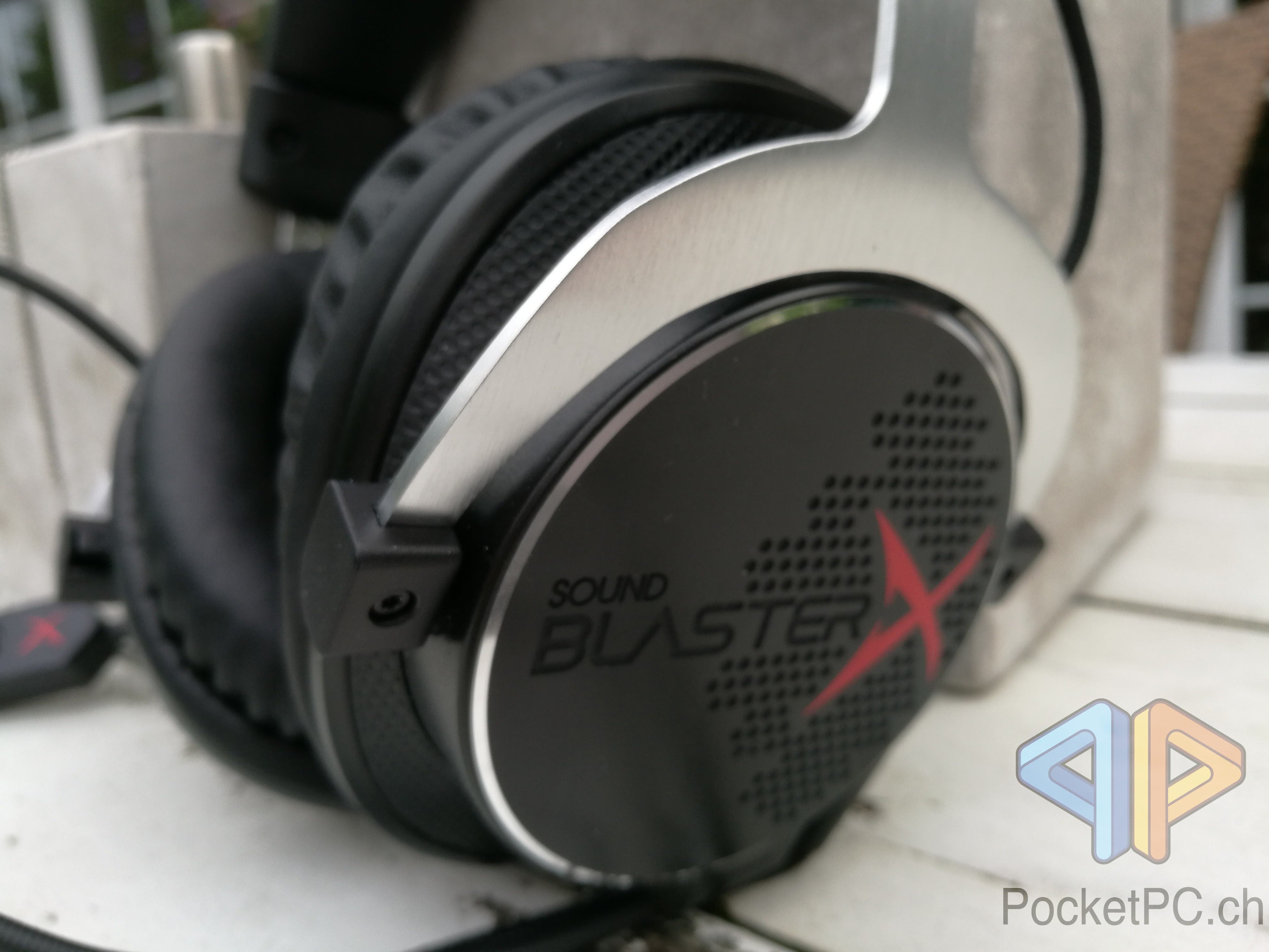 Das EVO ZxR war klanglich eines der besten Multifunktions-Headsets, die wir bis heute auf dem Kopf hatte, doch konnte die Verarbeitungsqualität nicht Ansatzweise dem damals noch weit über 300 Euro bzw SFr. teuren Headset gerecht werden. Das Sound BlasterX H5 hat hier schon ganz andere Qualitäten und wirkt trotz des deutlich geringeren Preises um ein vielfaches wertiger. Der Kopfbügel verbirgt unter der Polsterung bis hin zu den Ohrmuscheln ein sehr stabiles und flexibles Stahlband, an dessen beiden Enden sich die Hörermuscheln ordentlich ausziehen lassen und somit auch auf den grössten Köpfen platz finden. Auf den Ohrmuscheln selbst bestehen zwar grösstenteils aus Kunststoff, doch wirkt die aufgesetzte Aluminiumplatte auf den Aussen recht stimmig. Markant ist auch das grosse rote X der neuen Sound BlasterX-Marke. Gefallen muss das zwar nicht allen und für Fans von Schlichtheit wohl ein Akzent zu viel, doch uns hat es durchaus gefallen. Die Ohrmuscheln selbst sind in Gelenken eingefasst und sind dadurch ebenfalls beweglich, was der Anpassung an die Kopfform zuträglich wird. Zudem ist es mit 250 Gramm für die im ersten Eindruck recht wuchtigen Ausmasse sehr leicht, was der Qualität aber nicht abräglich ist.