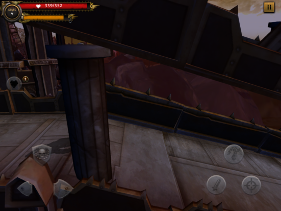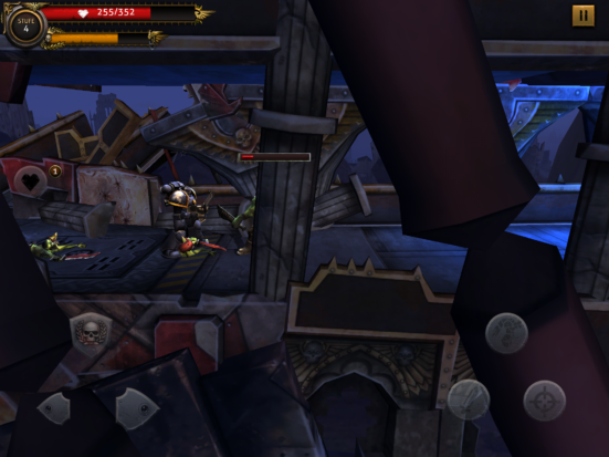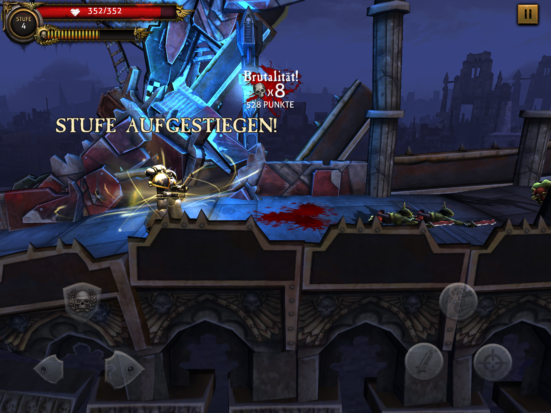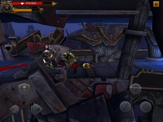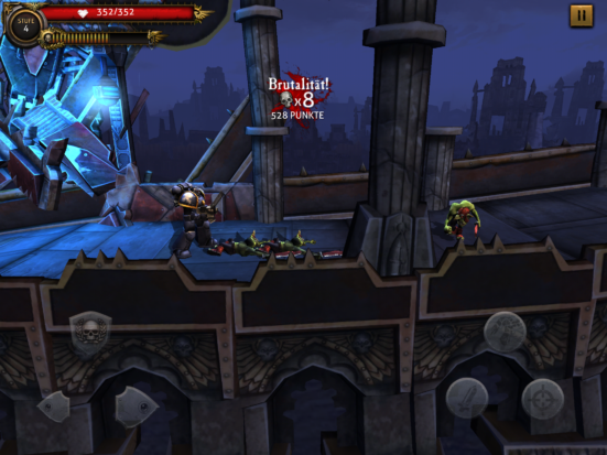 Dasselbe gilt übrigens auch für die Grafik. Diese ist zwar gut und vor allem in der nativen Auflösung der iPad Air und iPad mini 2 Modelle extrem scharf, doch sind die Texturen im Allgemeinen relativ detailarm. Auf Android kommt die etwas niedrigere Auflösung und die nicht ganz vorteilhaft eingesetzte Kantenglättung zum Vorschein, was zu Kantenflimmern führt. Generell ist es auf allen Plattformen so, dass es hier und dort kleinere Clipping-Fehler gibt und der Space Marine auch einmal mit den Füssen im Boden steht, was allerdings nur sehr selten passiert. Auf Apples Tablets macht Warhammer 40K Carnage vor allem im Bereich der Kantenglättung und der hohen Auflösung einiges her: Treppenstufen sind nahezu nicht zu erkennen. Allerdings konzentriert man sich eh auf das Gemetzel im Vordergrund. Zum Stehenbleiben und Bestaunen der Grafik lädt der Titel aber nicht ein.