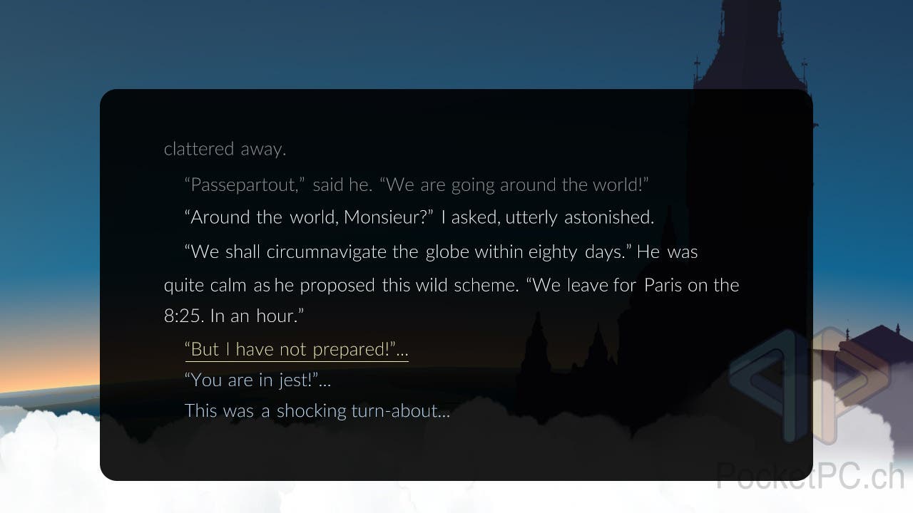 Dabei wählen wir aus werden über 170 Orte die Route auf diesem abenteuerlichen Unterfangen aus. Auf dieser Reise sind Fogg und Passepartout per Zug, Luftschiff, Bewegte Stadt, Ice-Walker, Hydrofoils und viel kuriosen Fortbewegungsmitteln unterwegs. Hunderte verschiedener Wege führen so zum Ziel und lassen die beiden Helden die unterschiedlichsten Personen treffen, die alle über verschiedene Geschichten und Charaktere verfügen. Manche helfen uns weiter, manche sind nur auf ihren Vorteil bedacht oder gar eine Gefahr.