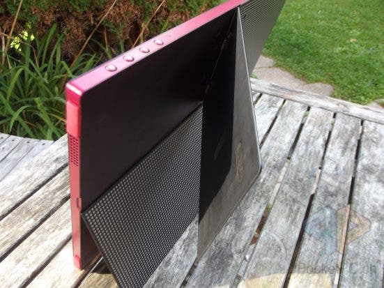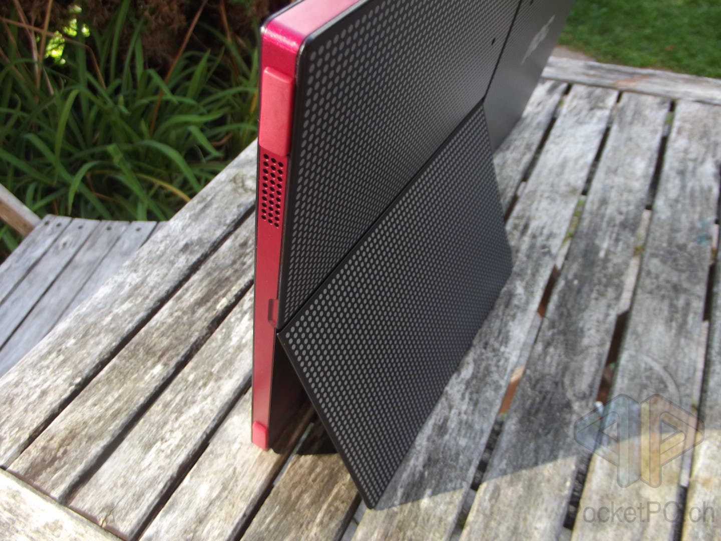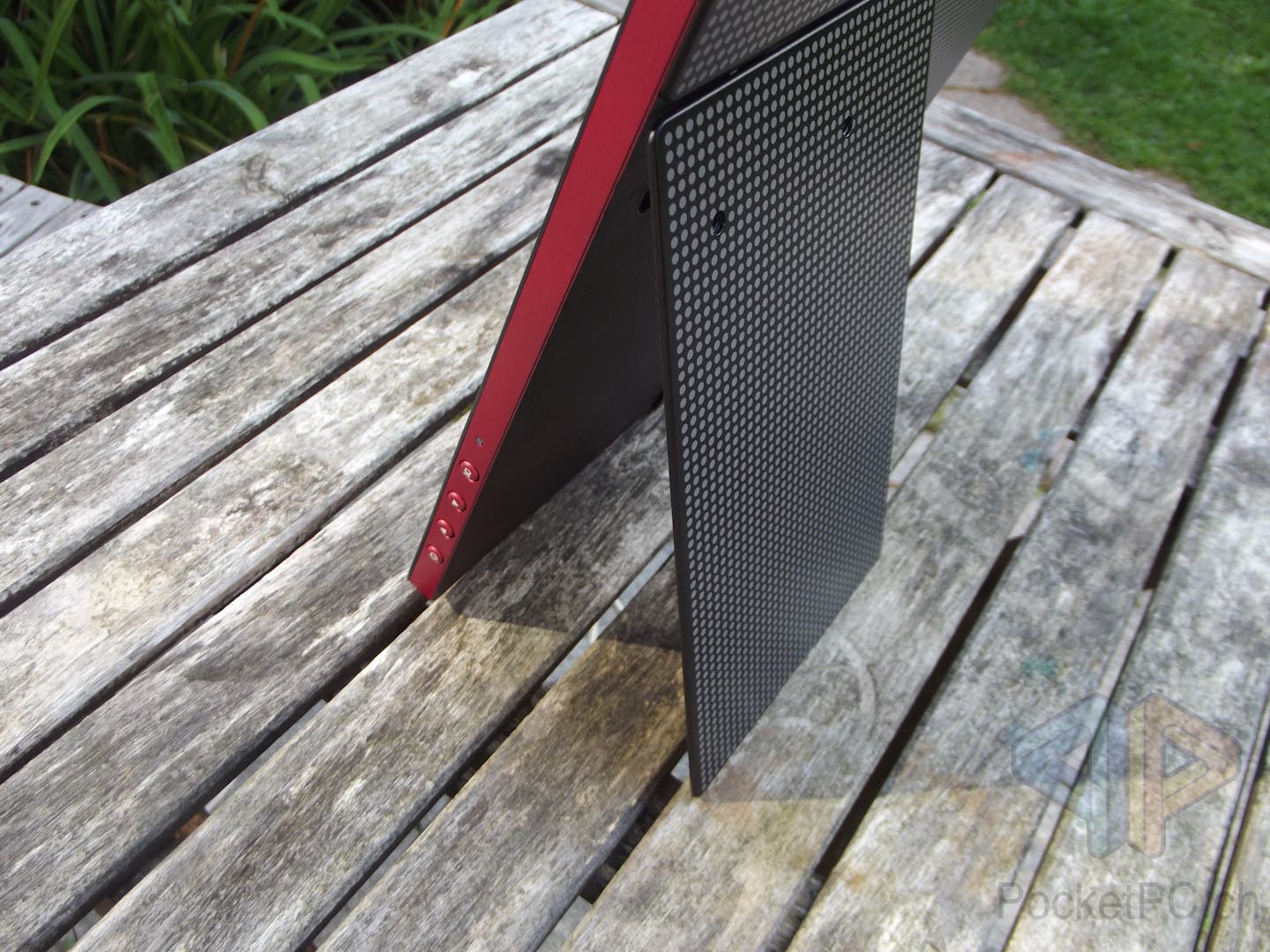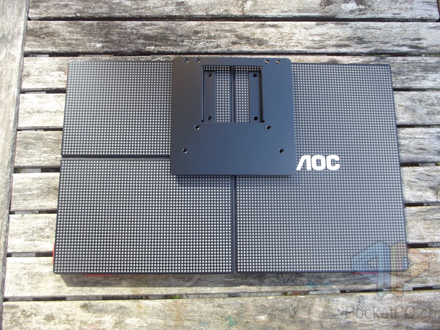 Im Metallrahmen befinden sich zudem zwei 1 W starke Lautsprecher, die seitlich im roten Rahmen untergebracht sind. Die Rückseite birgt zwei ausklappbare Kickstands aus Metall und vier Gewinde für eine VESA 50×50 Halterung. Der entsprechende Adapter ist mit im Lieferumfang und kann einfach angeschaubt werden. Die beiden Ständer mit grau gepunktetem Aufdruck lassen sich einfach und stufenlos ausklappen und so kann der AOC 16G3 bequem auf den Gummifüssen stehen, die zu zwei Seiten im Gehäuserand untergebracht sind.