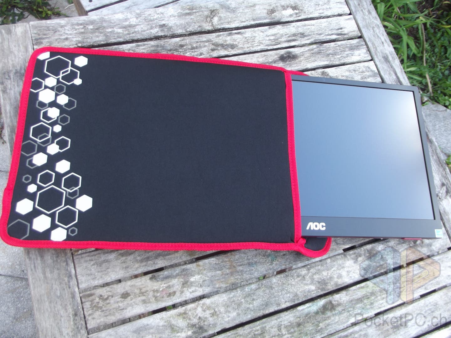 Der AOC 16G3 Portable Screen macht einen hochwertigen und stabilen Eindruck. Auch oder gerade weil der Rahmen das IPS-Panel leicht absetzt, hat man nicht das Gefühl, dass das Display schnell einen Schaden davontragen würde. Zudem ist der Neopren-Sleeve im Lieferumfang enthalten, der eine simple aber effektive Transportlösung bietet. Nur Kabel und Netzteil müssen dann noch separat transportiert werden. Einen Akku hat der AOC 16G3 nämlich nicht. Was jedoch gefällt, sind die beiden ausklappbaren Kickstands. So kann der Bildschirm problemlos horizontal wie vertikal aufgestellt und entsprechend nach eigenen Vorlieben und Rahmenbedingungen geneigt werden.