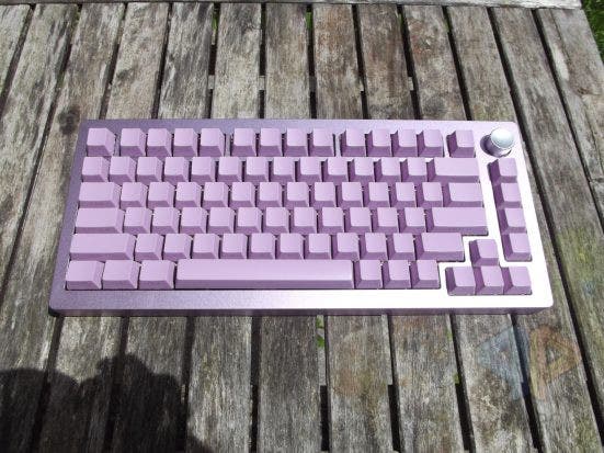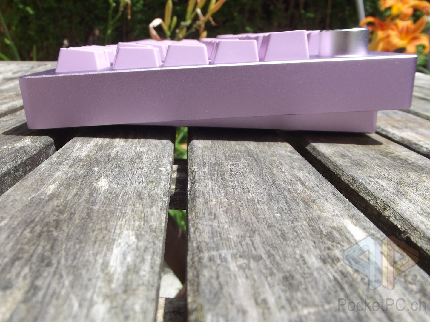 Das Tide 75 Keyboard von EPOMAKER ist 330 x 146 x 21.5 mm gross und wiegt 1800 Gramm. Das Keyboard ist mit 82 Tasten in der jeweiligen Keyboard-Farbe und einem silbernen Drehknauf ausgestattet. Neben der Variante in Lila gibt es das EPOMAKER Tide 75 auch in Pink, Schwarz und Blau. Das Gehäuse der Tastatur besteht aus Aluminium und die RGB-Tastenbeleuchtung ist nach Süden ausgerichtet. Auch hier setzt EPOMAKER wieder auf ein TKL-Layout, also Tenkeyless, ohne Ziffernblock. Die Pfeiltasten sind vorhanden und an der Üblichen Position, lediglich die Funktionstasten rechts von dem herkömmlichen Tastaturlayout sind vertikal angeordnet, um Platz zu sparen. Darum ist die Tastatur auch nur 75 Prozent so gross wie normale Keyboards. Zudem hat die Tide75 auch wieder seitlich bedruckte Tasten. Oben ist alles blank und gleichförmig. Das sieht cool aus, ist aber etwas ungewohnt.