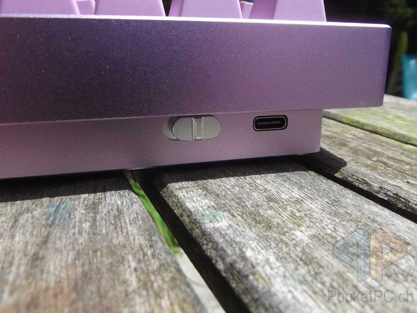 Im Inneren des Tide 75 ist ein 4000 mAh starker Akku verbaut, denn die Tastatur von EPOMAKER kann nicht nur per USB-C verbunden werden, sondern unterstützt ebenfalls Bluetooth 5.0 sowie den Anschluss per 2.4 GHz-Dongle. Ein- und Ausschalten sowie Aufladen oder Verbinden mittels USB-C kann man die EPOMAKER Tide 75 oben links. Das Keyboard ist von Werk aus nur mit EPOMAKER Lemon Switches erhältlich. Diese linearen mechanischen Schalter kommen mit dem handelsüblichen 5 Pins zur Verbindung daher, auch wenn die Tide 75 daneben auch mit 3-Pin-Switches leben kann. Die Lemon Switches sind aus PA6 gefertigt und beherbergen ein 22 mm Feder, die einen Hubweg von 3.5 mm mit bringt. Die Betätigungskraft ist mit 40 g (± 2 g) angegeben und der Betätigungsweg beträgt 1.6 mm. Die Schalter sind für 50 Millionen Anschläge ausgelegt.