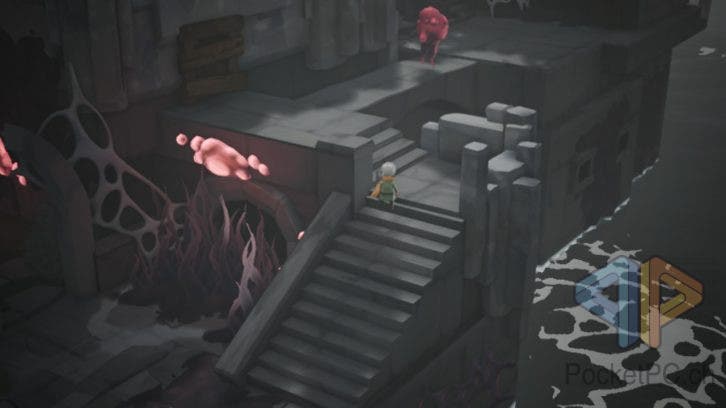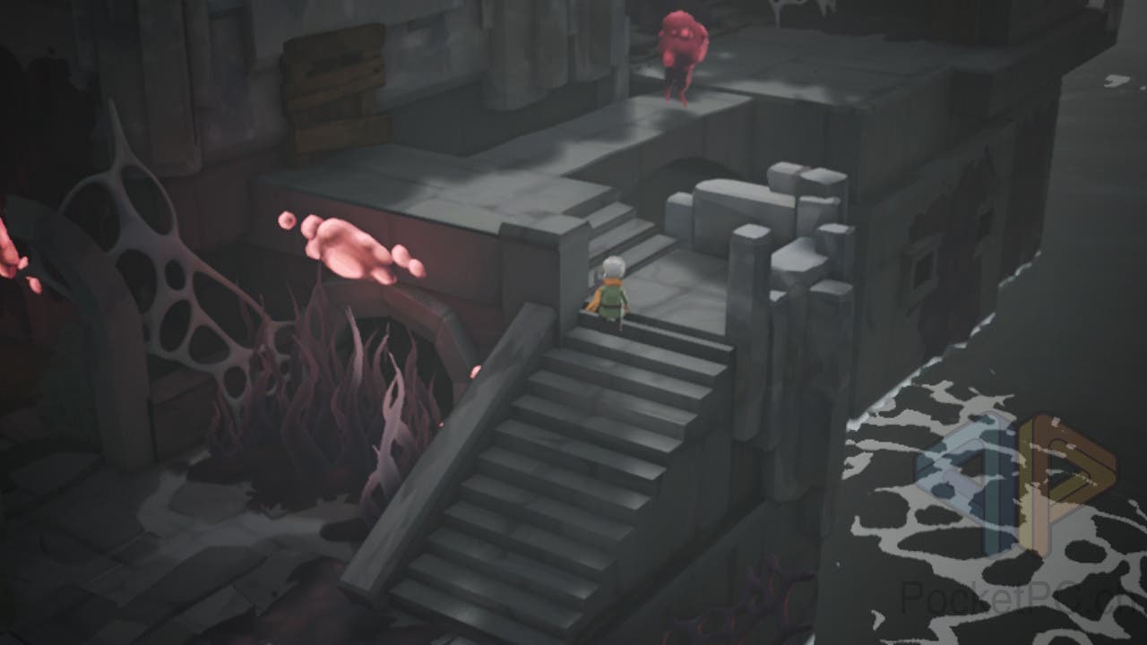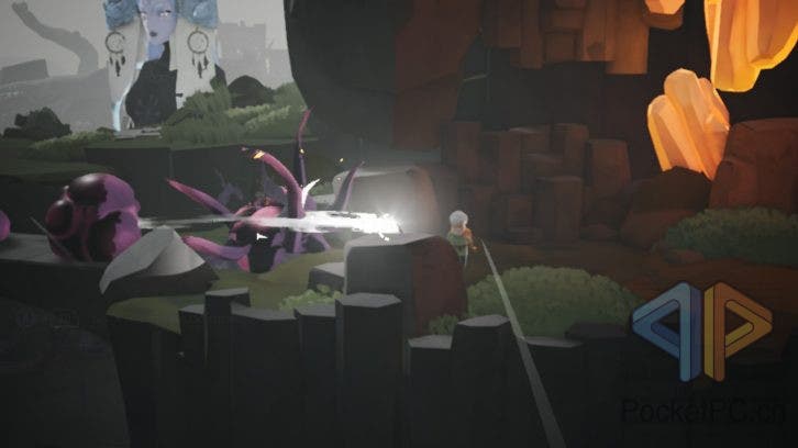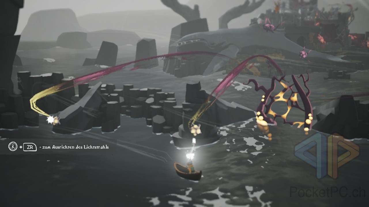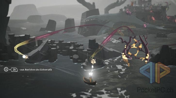 Und auch das Miasma, meist als wuchernde, schlingpflanzenartige, dunkellila Struktur zu sehen, stellt uns auch noch andere Feinde in den Weg, die mit dem glühenden Licht des Stabs bekämpft werden müssen.