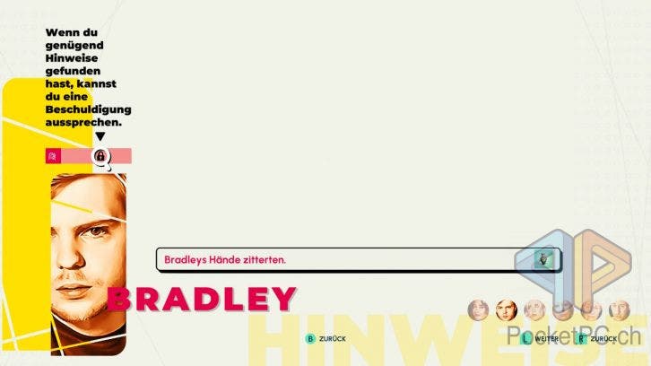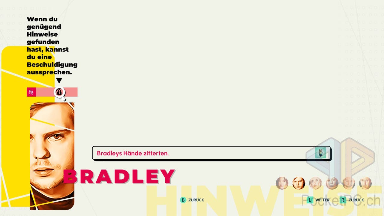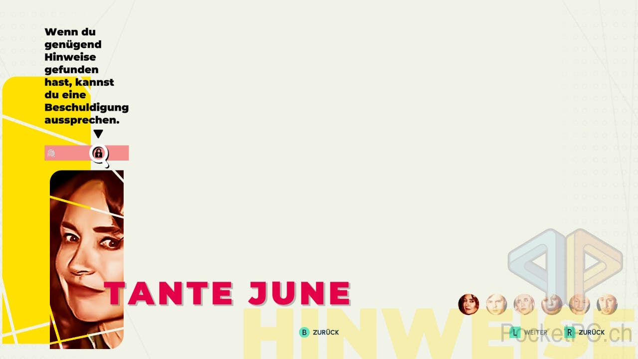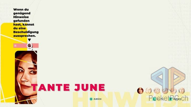 Nach jeder Spielrunde des Familienquiz wird ein Zwischenstand angezeigt, bei dem die gesammelten Hinweise und Informationen über den Tathergang sowie die einzelnen Verdächtigen aufgeführt werden. Hat man genug Hinweise über ein Familienmitglied gesammelt, kann man eine Beschuldigung aussprechen. Diese kann sich natürlich trotzdem noch als falsch herausstellen.