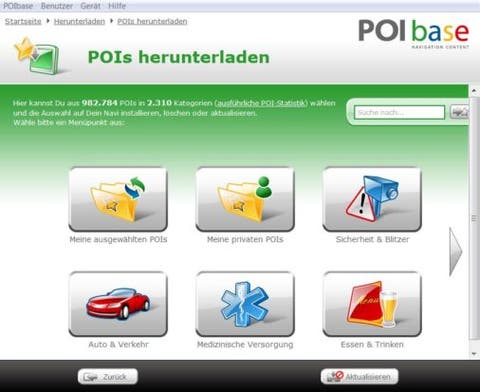 Die POIs und Blitzerdaten werden über den PC auf das Gerät geladen. So verbindet man das Gerät mit dem PC und wählt die gewünschten Kategorien aus. Es werden folgende vier Produkte bei POIBase angeboten, welche unterschiedliche POIs der Länder beinhalten: