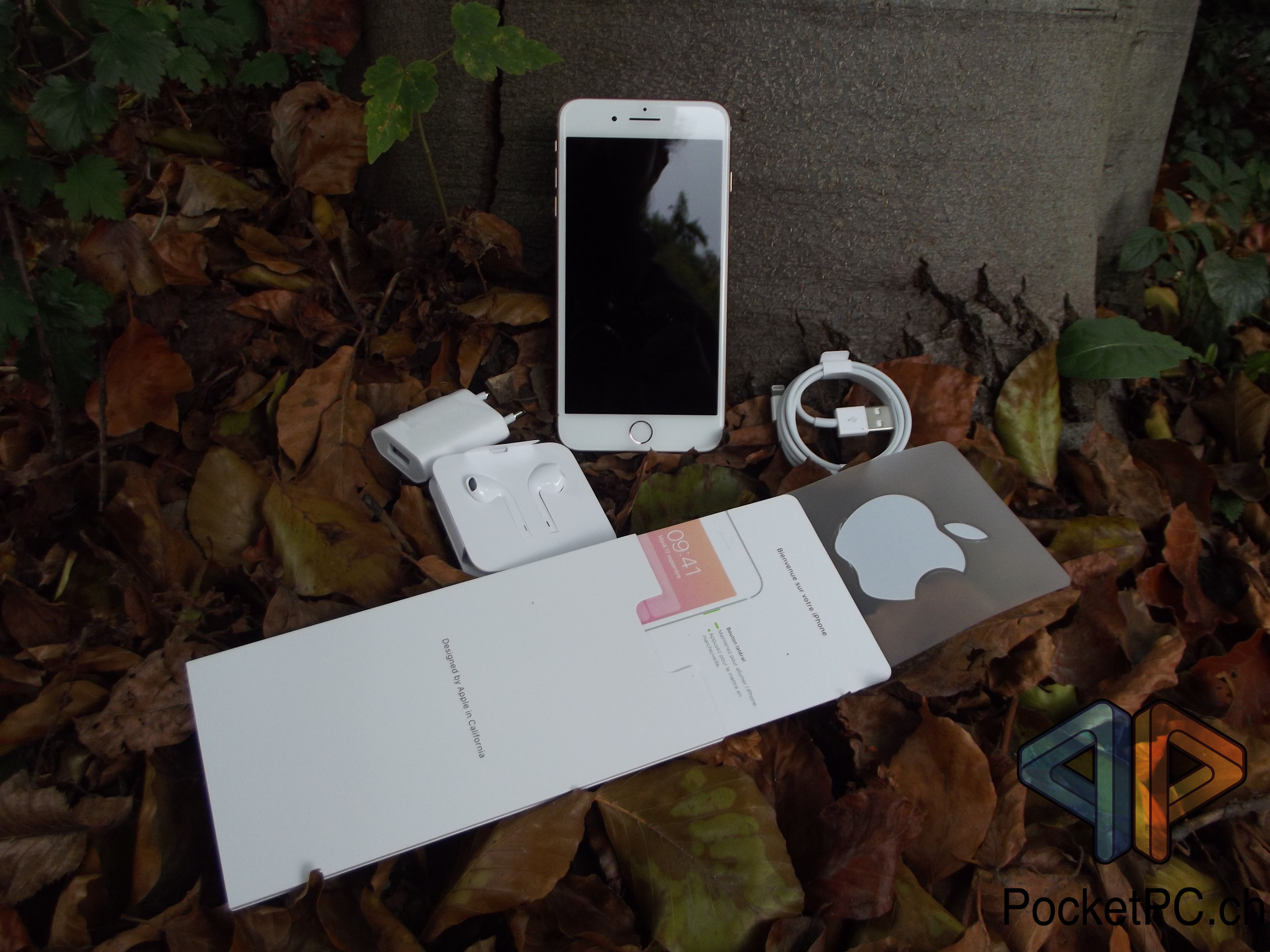 Auf der typisch weissen Pappschachtel ist das innen enthaltene iPhone 8 Plus abgebildet, in der Farbe abgebildet, in der es auch daherkommt. In unserem Fall handelt es sich um das goldene Gerät. Öffnet man die Schachtel, bekommt man Zugriff auf das iPhone 8 Plus, ein Papiermäppchen mit einer Kurzanleitung, dem SIM-Kartenslotöffner und Apple-Stickern. Unter dem iPhone 8 Plus befinden sich das Netzteil, die kabelgebundenen Kopfhörer mit Lightning-3.5 Klinkenanschluss-Adapter sowie das Lightningkabel zum Aufladen des Geräts.