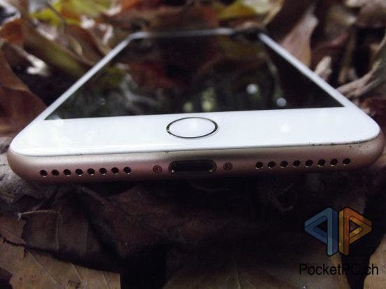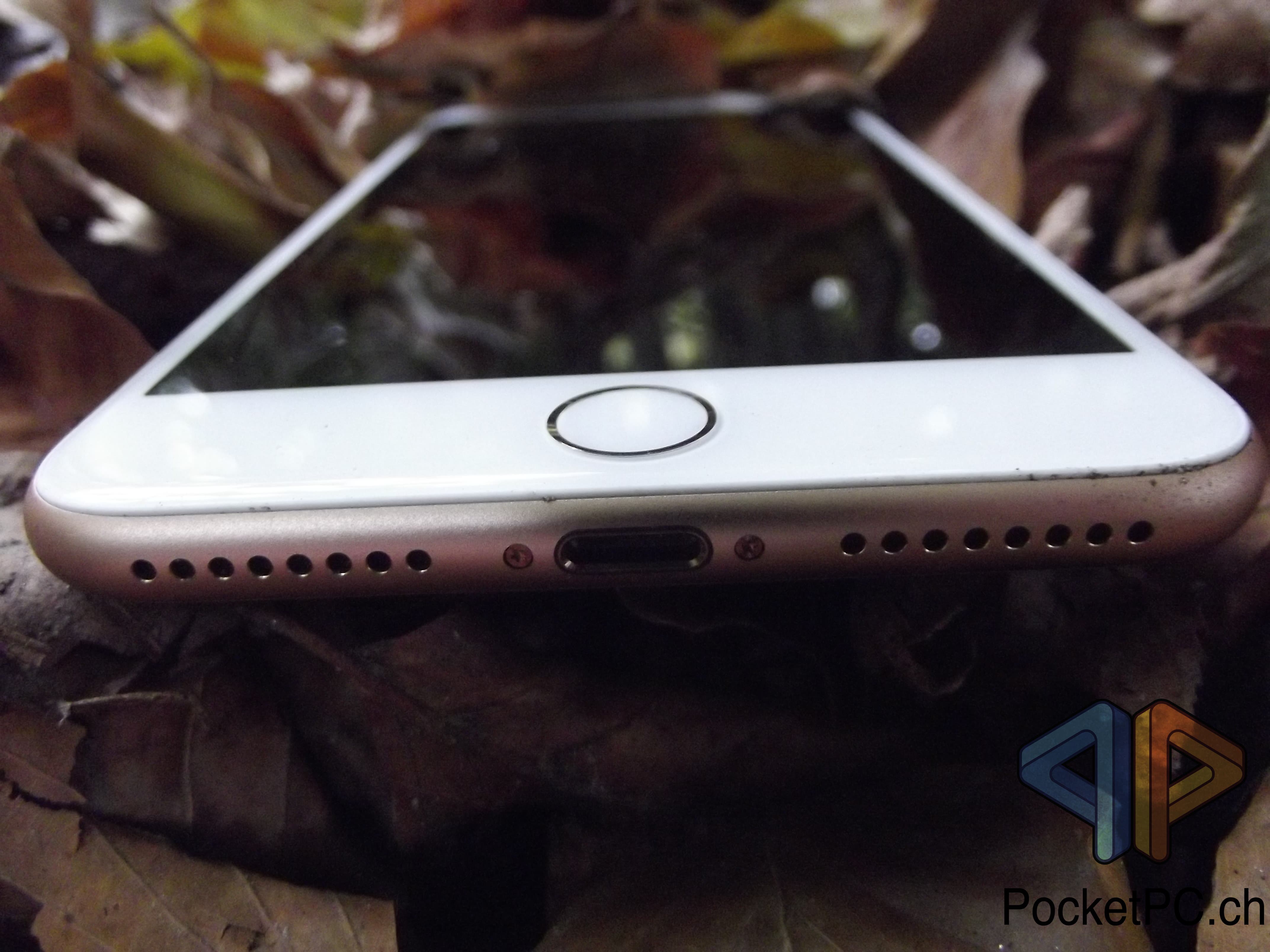 Auf der Vorderseite des iPhones befindet sich der Home Button, welcher wie schon beim Vorgänger eine rein kapazitive Fläche ist, die sich dank Vibrationsresponse wie ein echter Knopf anfühlt. Die Fläche agiert zugleich als Fingerabdrucksensor, was auch gewohnt gut funktioniert. Am unteren Rand des iPhones befindet sich der Lightning-Anschluss sowie die Lautsprecher, links mittig der SIM-Kartenslot und oberhalb davon der On/Off-Knopf. Am rechten Rand findet man die Lautstärkewippe und den bei Apple obligatorischen Sound-Knopf zum schnellen Ausschalten der Klingeltöne etc. Die Frontkamera ist sehr unauffällig in die Front eingelassen, die Hauptkamera befindet sich in der linken oberen Ecke der gläsernen Geräterückseite. Wie schon beim Vorgänger ist sie leicht erhaben und von Aluminium umrahmt. Zentral auf der Rückseite prangt das Apple-Logo.