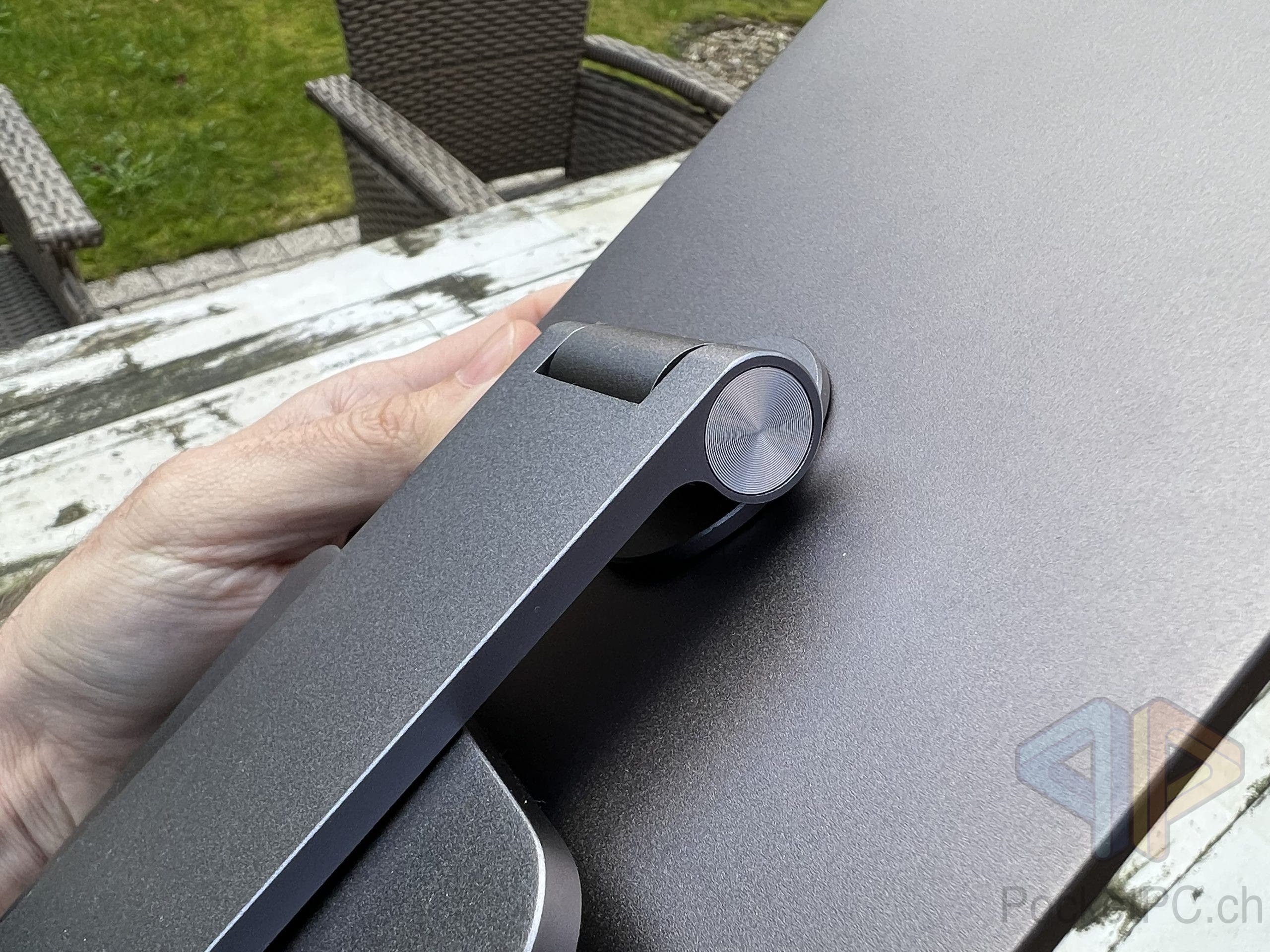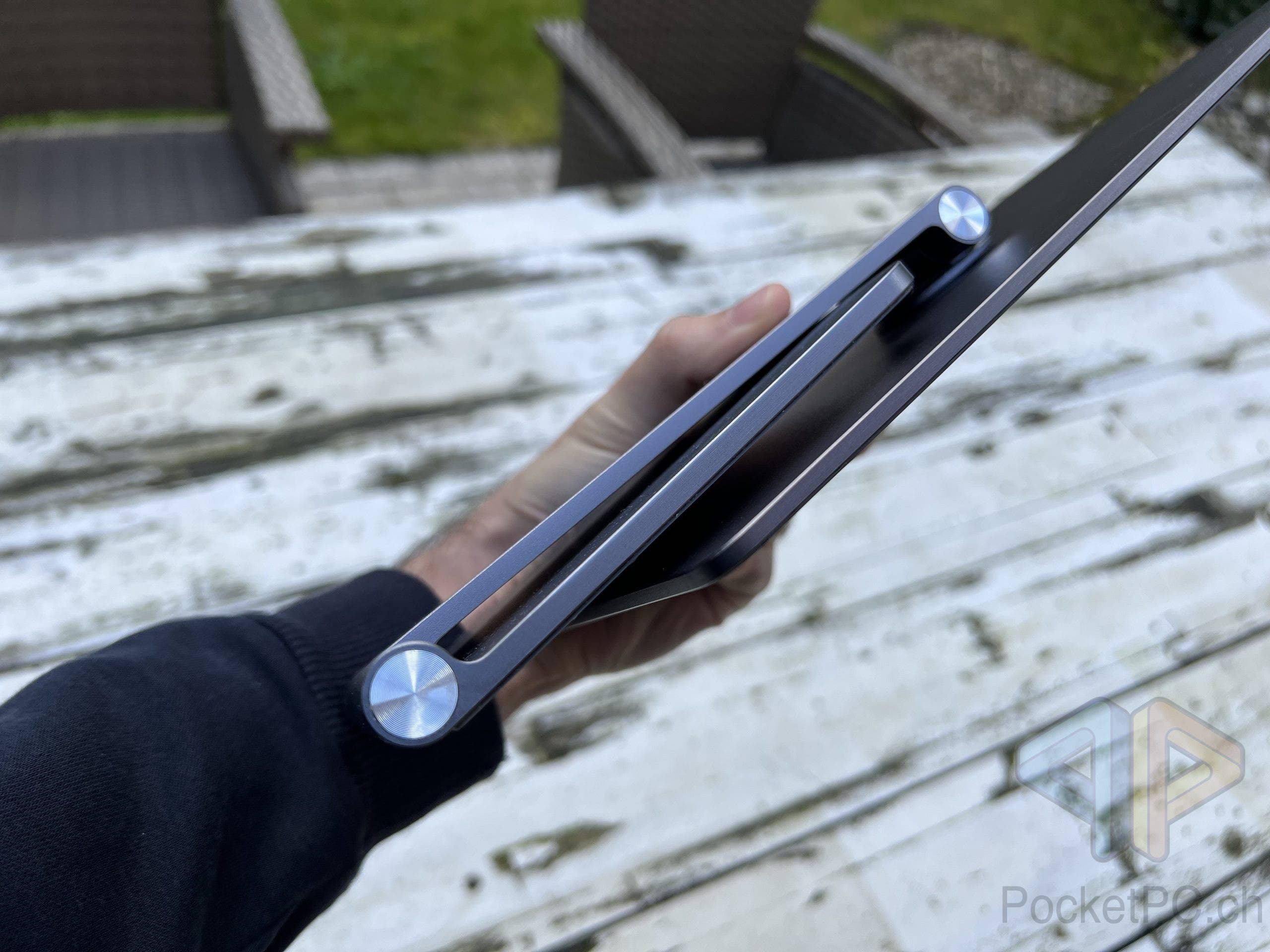 Wie schon erwähnt, das iPad Pro oder sich iPad Airs lassen sich sehr einfach magnetisch anbringen. Einfach nur aufsetzen und das Gerät hält tatsächlich bombenfest. Das ist auf der einen Seite natürlich ein grosser Vorteil. Schliesslich will niemand, dass das eigene iPad plötzlich den Abgang macht. Auf der anderen Seite sitzt es aber so bombenfest, dass es keine Technik gibt es mühelos wieder abzumachen. Der kleine Stand ist auch so leicht, dass ihr sowohl das iPad, als auch den Stand ordentlich festhalten und das Gerät irgendwie abziehen müsst.