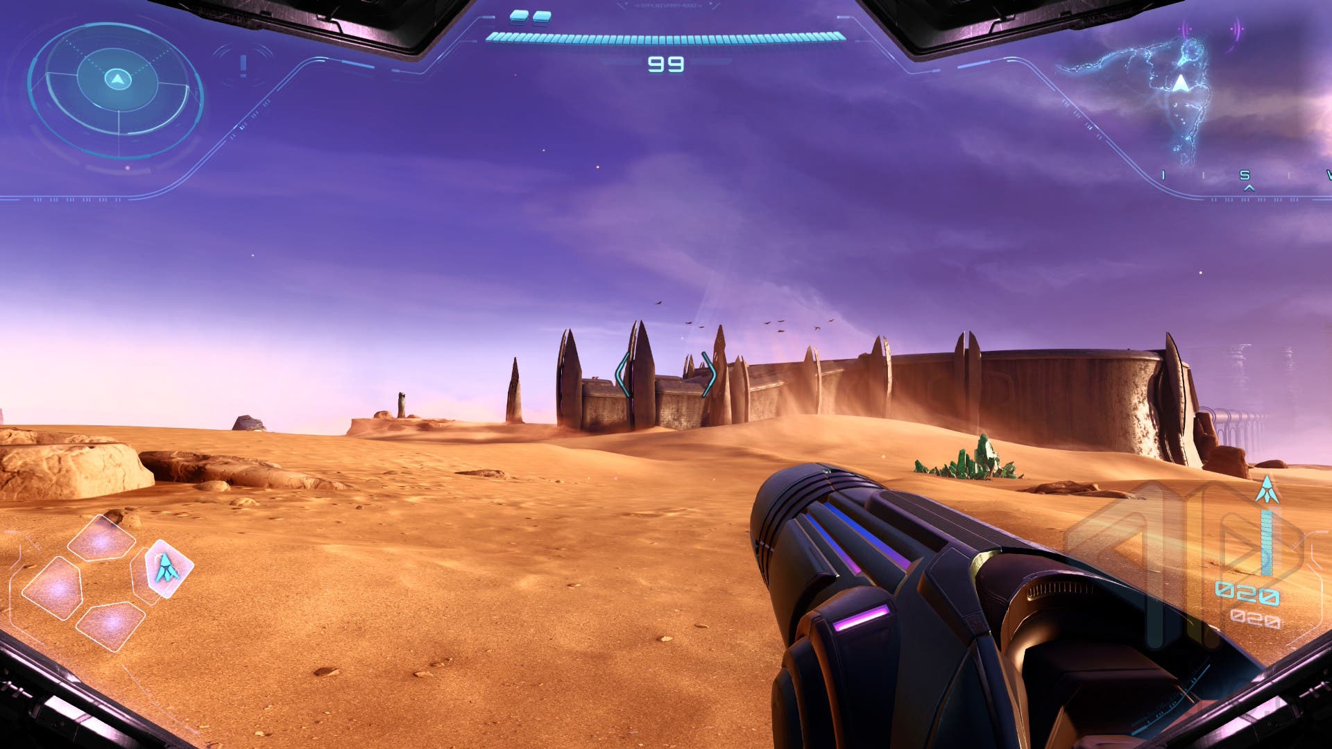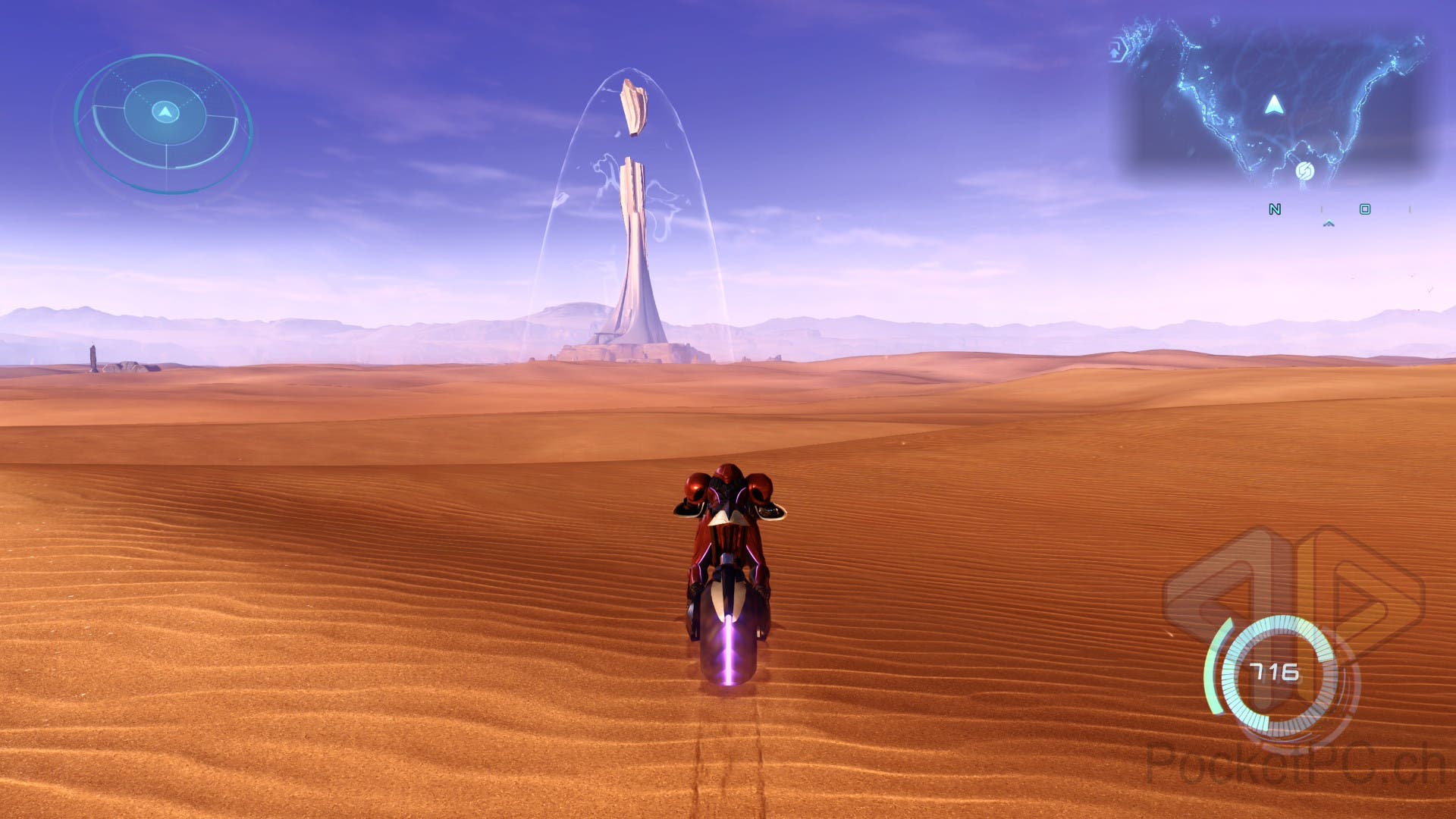 Haben wir den ellenlangen Prolog mit hunderten von Gameplay-Tipps erst einmal hinter uns gebracht, geht es erstmals in den “HUB” der Spielewelt. Die Wüste mit dem Namen “Sol Valley” verbindet an all ihren vier Ecken der Karte einen Dungeon mit einem thematischen Element und diese ist wirklich enorm riesig! In der Mitte befindet sich übrigens euer Ziel: Der Turm in den ihr zurückkehren und aktivieren müsst. Und hier beginnt auch schon die erste richtig grosse Lüge im Spiel. Sobald ihr die “Open-World” von Metroid Prime 4 Beyond in der Wüste betretet, funkt euch MacKenzie an und sagt “ab hier kannst du wählen wohin du gehen willst” und das ist absolut gelogen. Ihr könnt zwar beispielsweise zum Vulkan-Dungeon fahren, aber bereits nach den ersten 200 Metern in dem Gebiet kommt ihr nicht weiter, da ihr eine Waffenverbesserungen aus einem anderen Bereich benötigt und eigentlich braucht ihr DRINGEND dieses verdammte Motorrad, also müsst ihr sowieso den “Sturm-Dungeon” zuerst machen, um dann woanders hinzukommen. Ihr versteht also schon wohin das führt: Echte Freiheiten in Metroid Prime 4 Beyond zeigen sich im Test leider nicht, womit ich in erster Linie auch kein Problem hätte, wenn das Spiel mich von Anfang an einfach nicht belogen hätte.