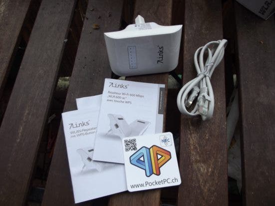 Das 60 x 100 x 50 mm kleine Gerät wird mit einer französischen und einer deutschsprachigen Anleitung sowie einem 1 m Netzwerkkabel geliefert. Der 7Links WLAN-Repeater ist wie ein mittelgrosses, symmetrisch aufgebautes Steckernetzteil gestaltet. Auf der linken Seite sind der Ethernetanschluss sowie ein Reset- und WPS-Taster zu finden. Durch die Unterstützung von 802.11a/b/g/n/ac kann das Gerät mit so ziemlich jedem WLAN-Signal verbunden werden. Die Vorderseite beherbergt sieben LED zur Statusanzeige. Neben der Netzwerkaktivität und der Signalstärke werden auch die jeweilig aktiven WLAN-Bänder angezeigt.